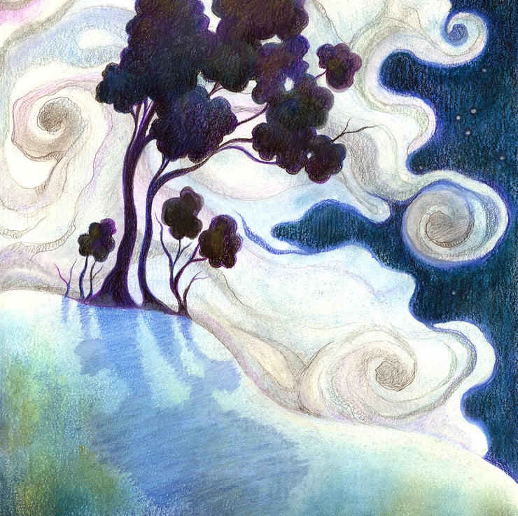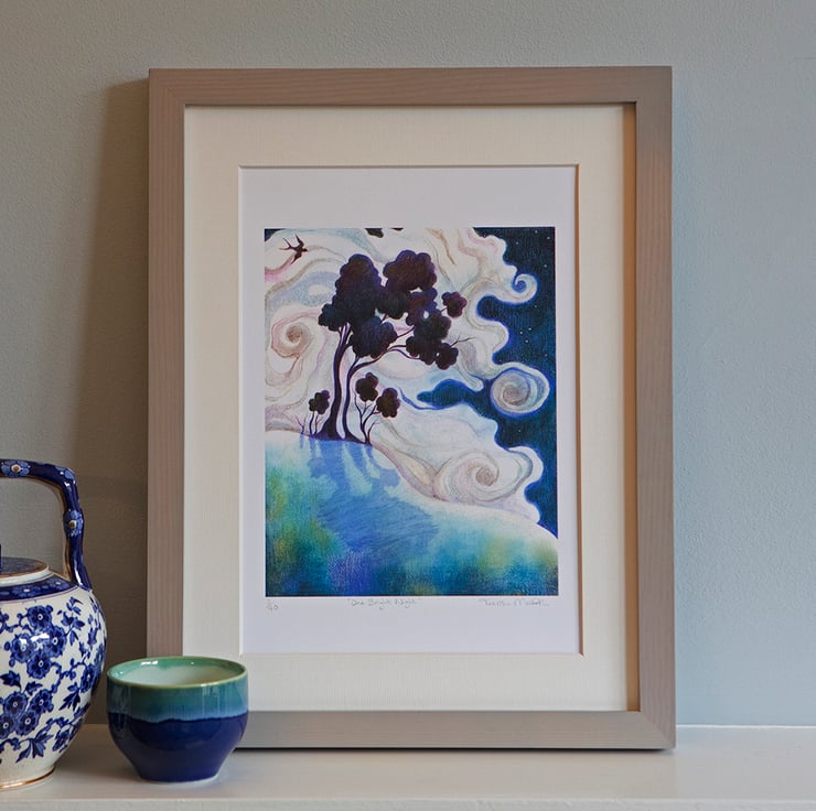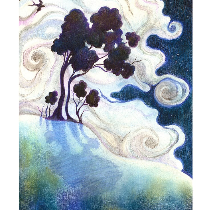 "One Bright Night" expresses a sense of ecstatic wonder in the landscape and the clouds in the sky - a magical evening! There is a lot of movement and energy embodied in this piece, which also features a swallow. I created it using chalk pastels and coloured pencils.