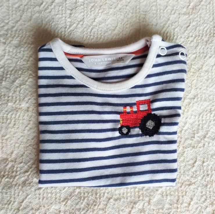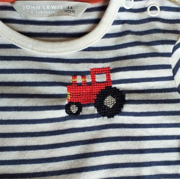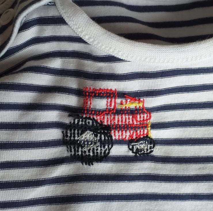 I have hand stitched a red tractor on this lovely soft organic cotton T-shirt by John Lewis. The shirt is off-white with narrow navy stripes. It has short sleeves and two press studs on the left shoulder to make it easier to pop over your baby's head. I never use a backing material when embroidering kids' clothes, so there is nothing inside the shirt to irritate your child's skin. The shirt can be machine washed.