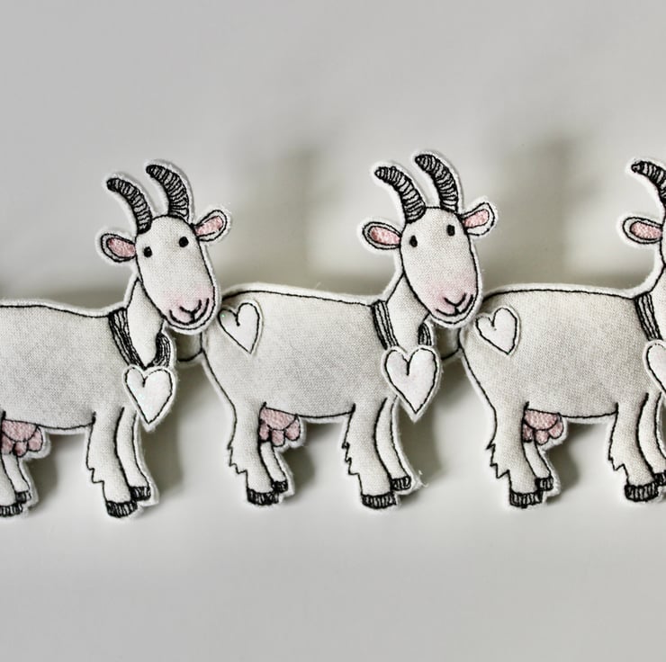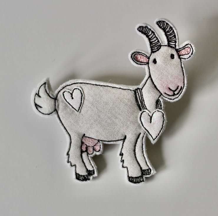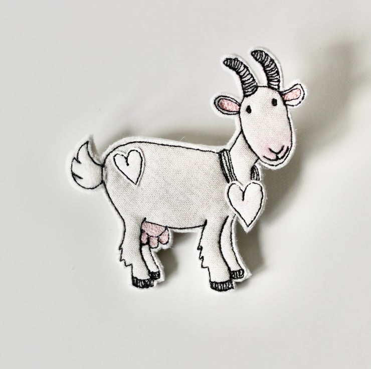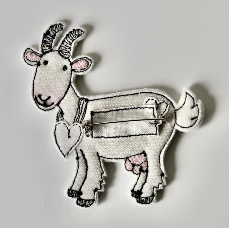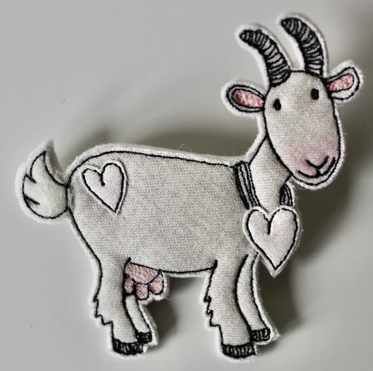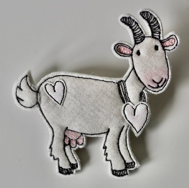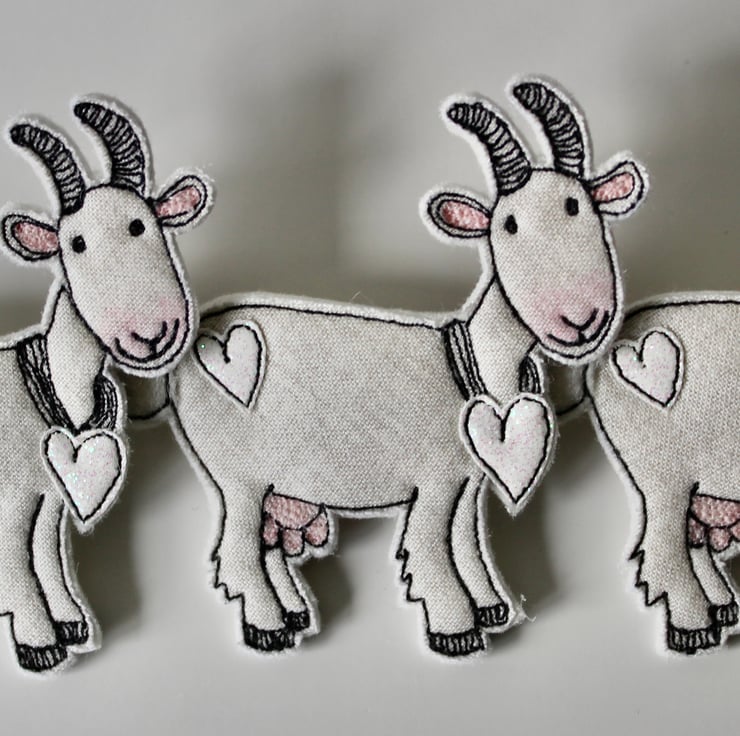 Goats are sewn using 100% wool felt, cotton cloth, glitter cloth and free hand machine embroidery; multiple layers of cloth are sewn together and cut out by hand using sharp scissors. The pin on the back is attached with hot glue and with a sewn fabric rectangle to secure.