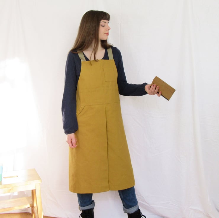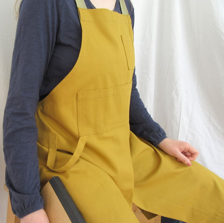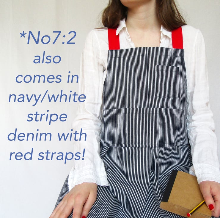 This No7:2 design originates from a cross back apron I designed for my first range on Folksy, which had long adjustable tie straps. Soon craftspeople asked for custom versions, potters and jewellery makers asked for a split leg skirt and tool loop etc. The set of wide pockets were set at waist height so that they would be easily accessable when the wearer is seated.