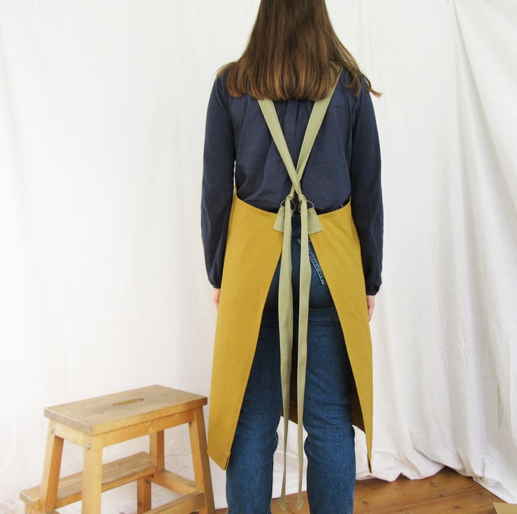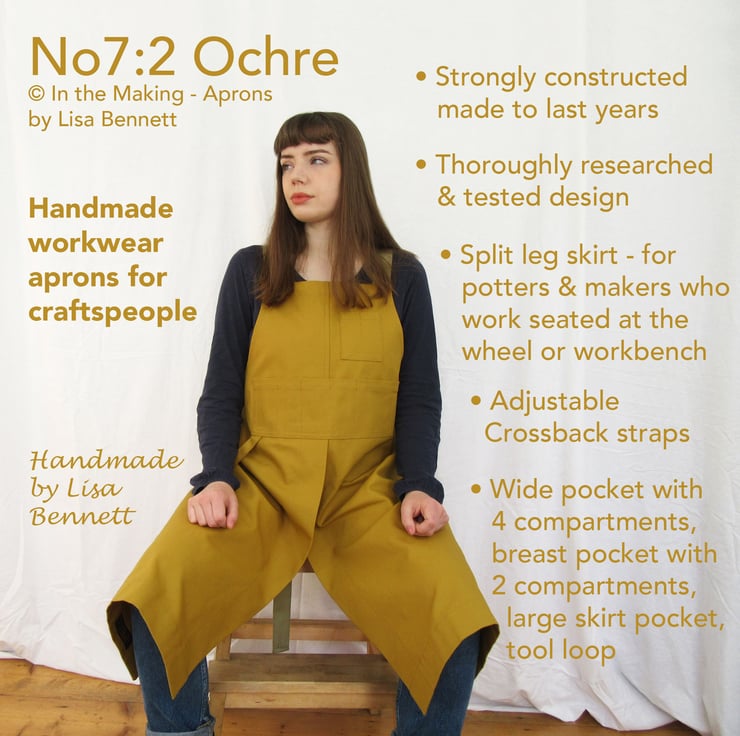 Exceptionally versatile potters/makers work apron – it’s packed with thoughtful design features and constructed using tough cotton canvas in a beautiful ochre colour. The ‘split leg’ feature gives plenty of movement and ensures each leg is covered when sitting at the potters wheel or workbench. This apron features an array of pockets including one with 4 compartments set at waist height for easy access when seated. Comfortable crossback straps adjust to fit across a wide size range and accommodate extra layers in a chilly studio! Thoughtfully designed, beautifully sewn and made-to-last, this apron is highly specialised workwear for craftspeople.