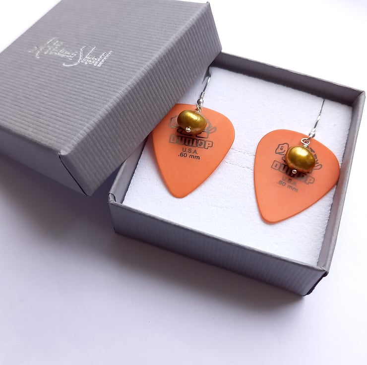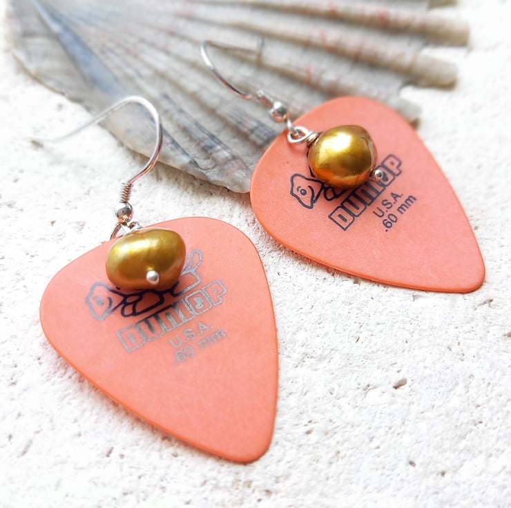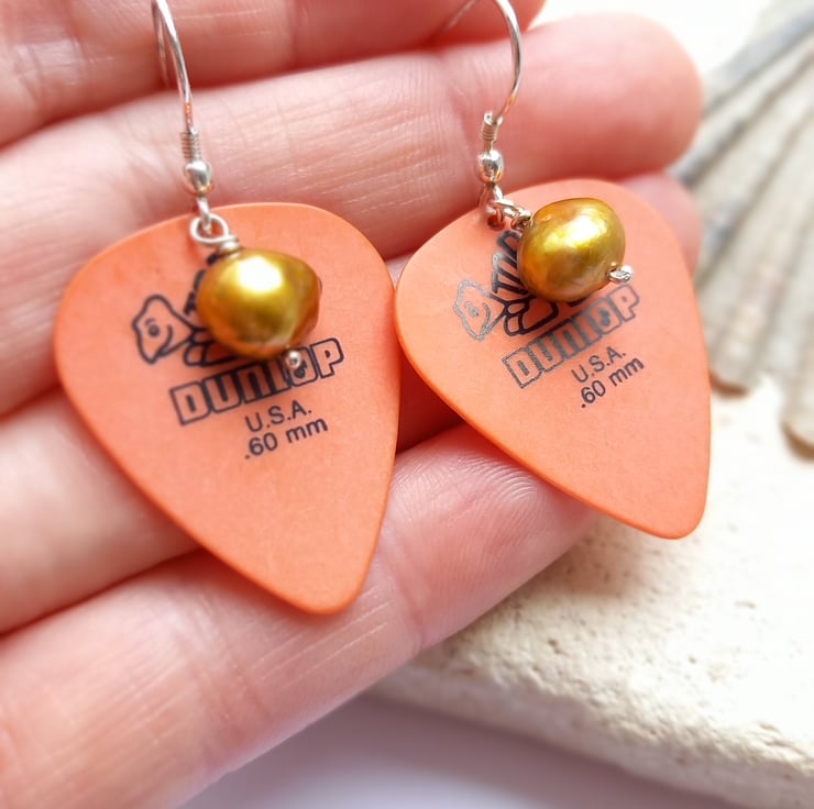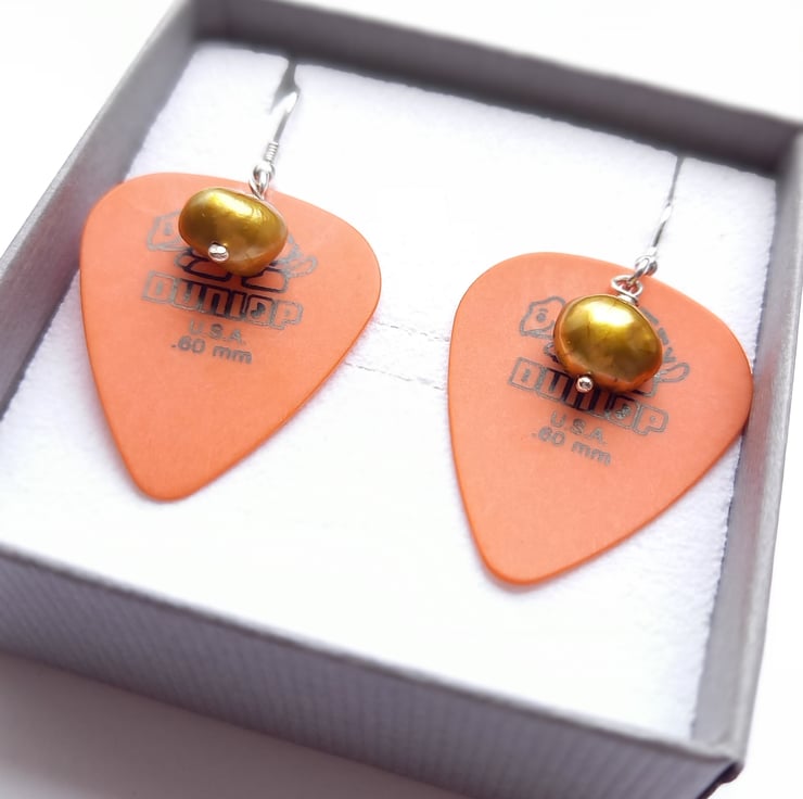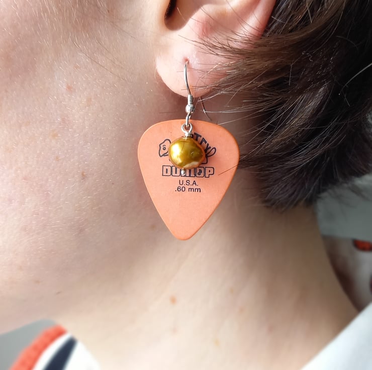 These cute earrings are made from recycled orange dunlop guitar picks and are finished off with yellow freshwater pearls.