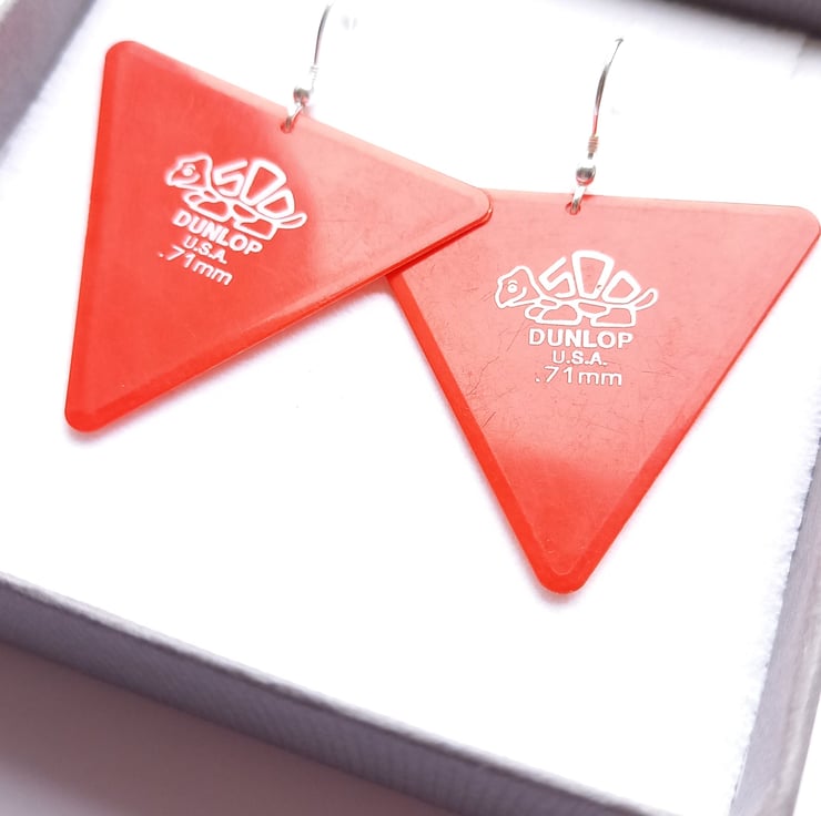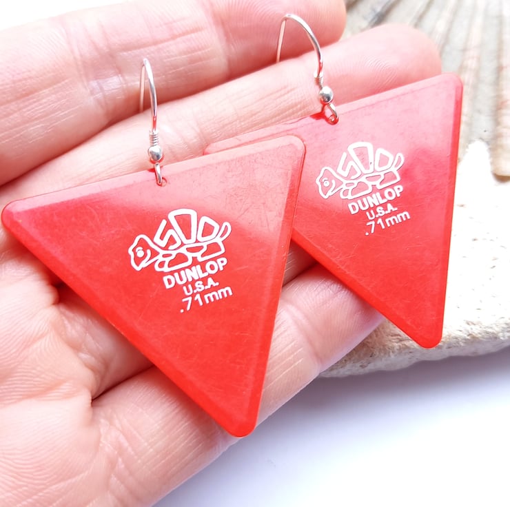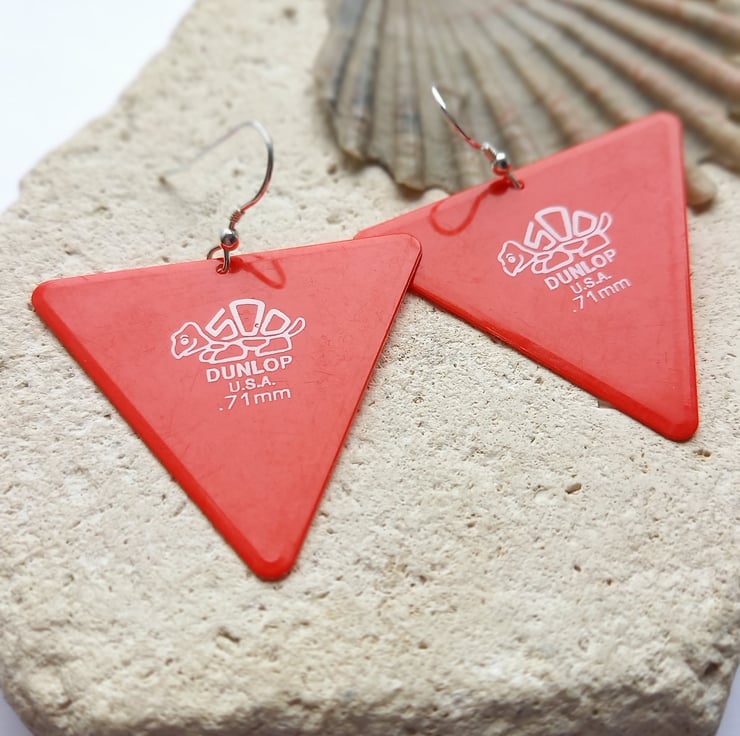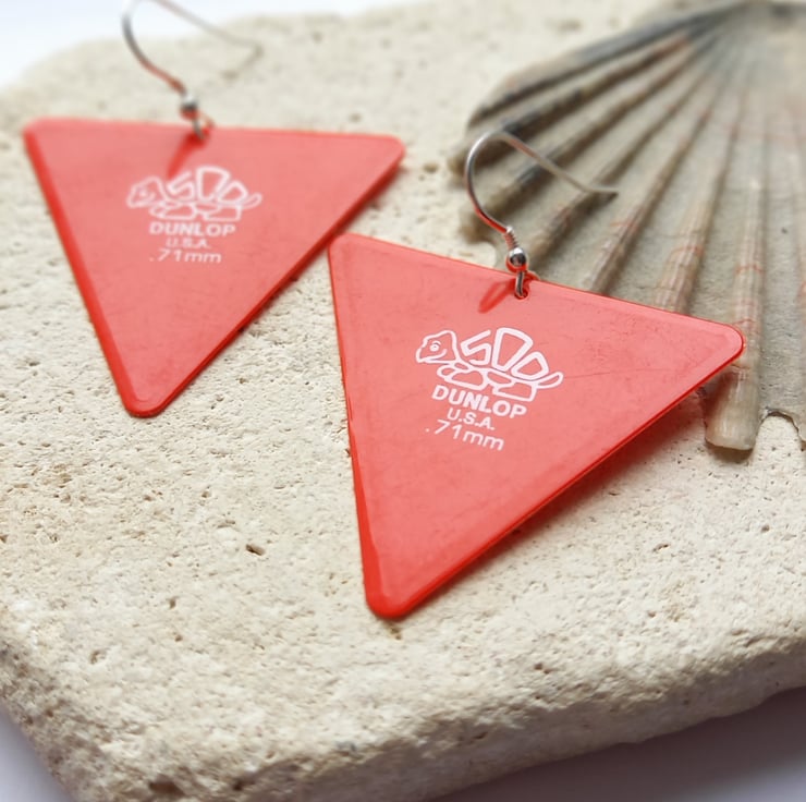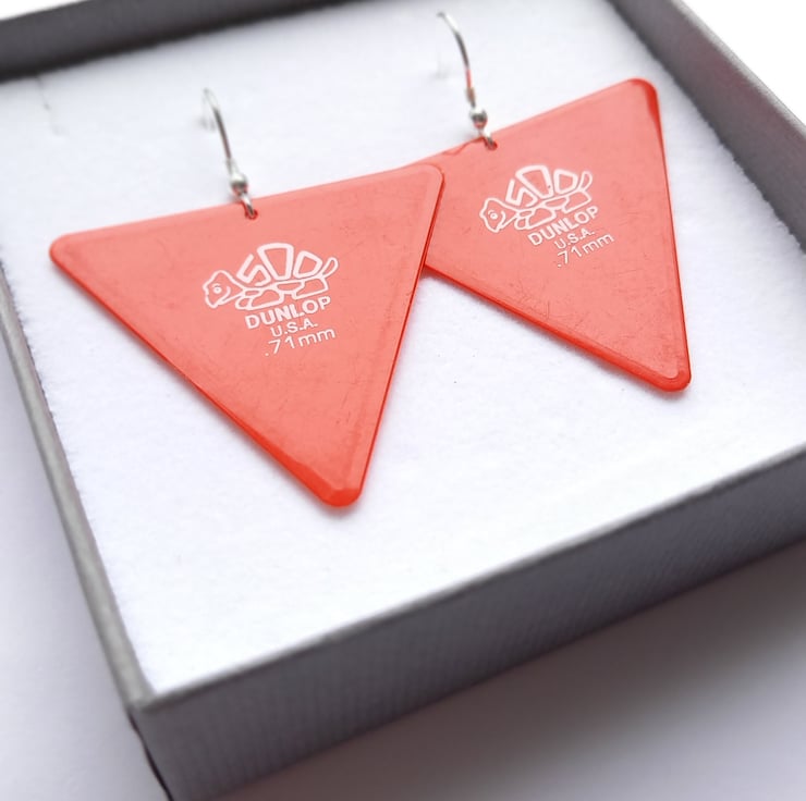 These bright earrings made from recycled dunlop guitar picks are so fun and make the perfect gifts for the guitarist in your life.