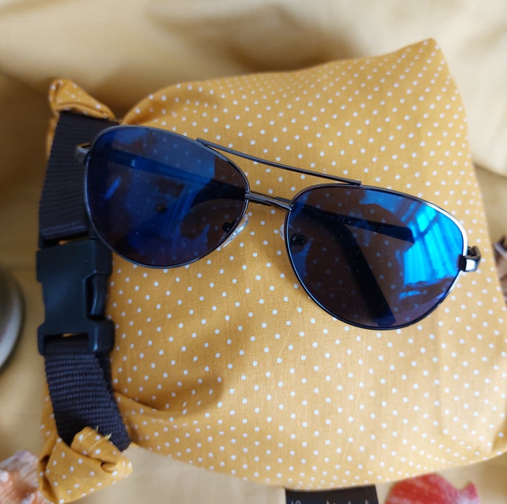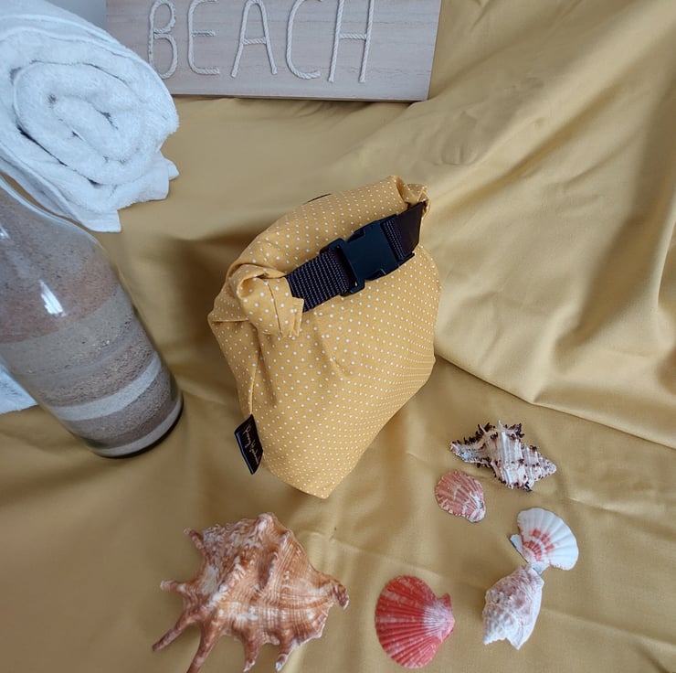 Drybag measuring 28x26cm. Depth of boxed corners are 9cm. Interior is a rubberised waterproof mustard lining with a handle inside for hanging out to dry. Outer is a coated cotton fabric. Roll top design with a webbing strap secured with a clip.