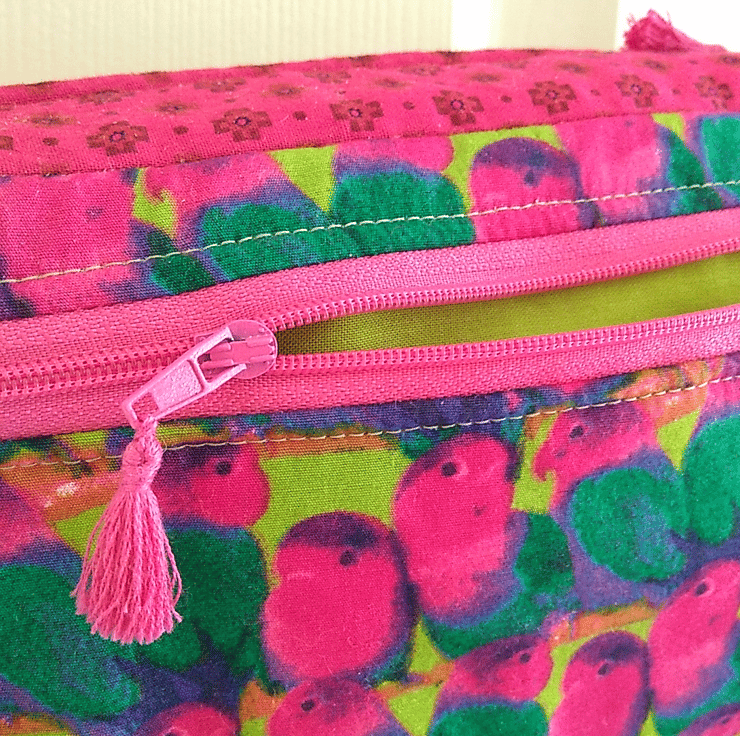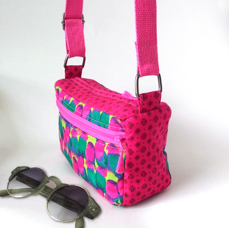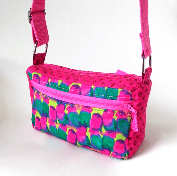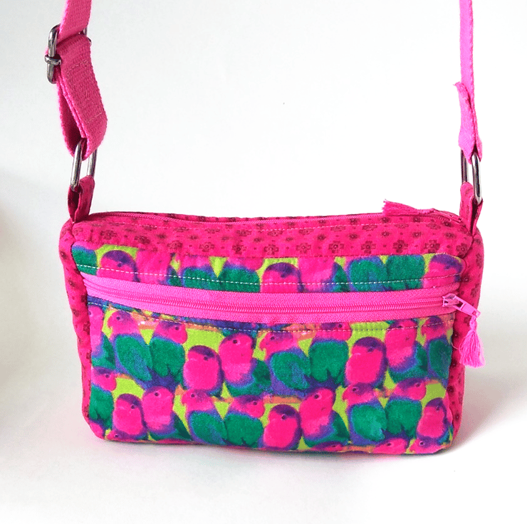 This quirky, boxy crossbody bag features a beautiful cotton fabric with colourful lovebirds / parakeets on, front and back. The birds are all in a row and in typical lovebirds’ position – cuddled up against each other. I am no expert on lovebird mutations but I think these may be Fischer Lovebirds, albeit with a new colour mutation of pink and green! This would be a lovely gift for a bird lover or pet bird lover.