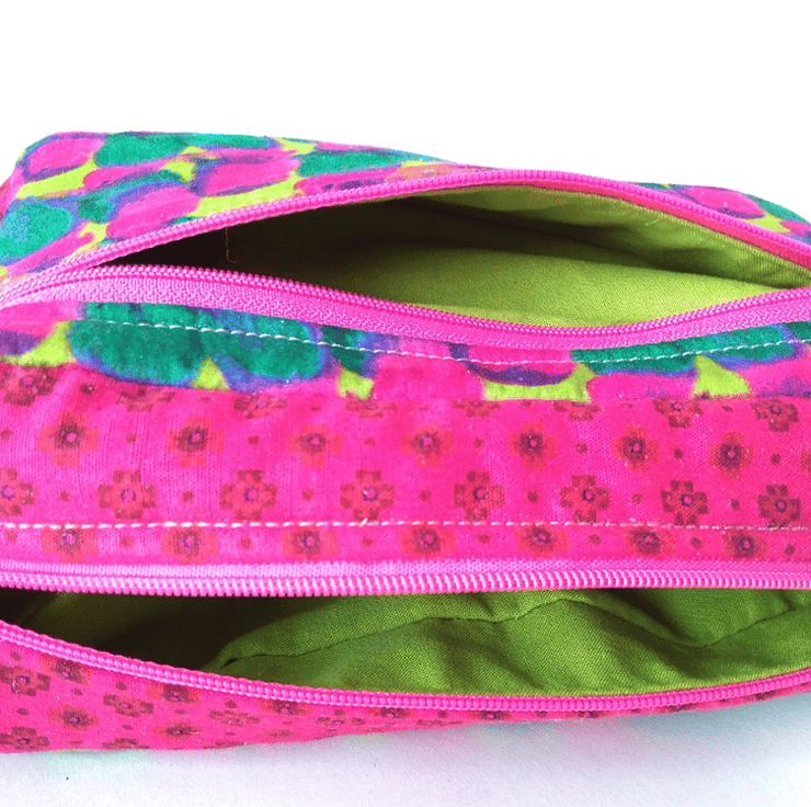 The fabric used for the gusset (top, sides and bottom) is pink with a small brown plus pattern. The lining is a plain lime green. This bag has two zipped compartments – one main one accessed from the top and another on the side. The pink cotton webbing strap is adjustable.