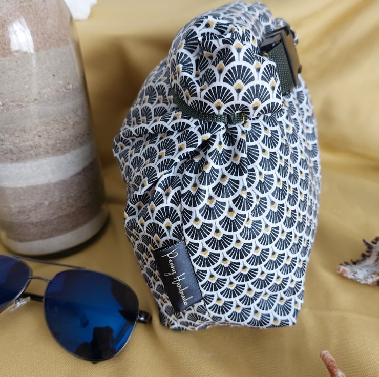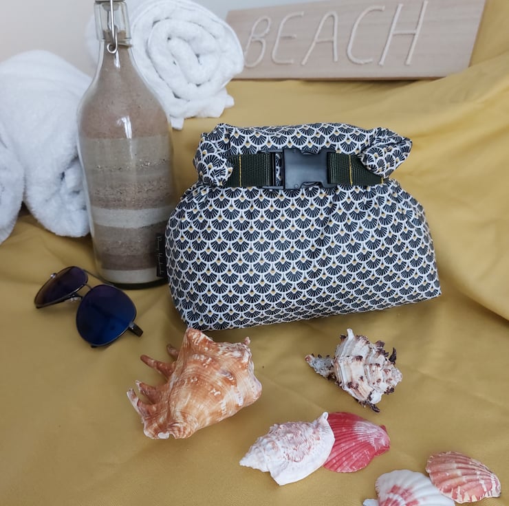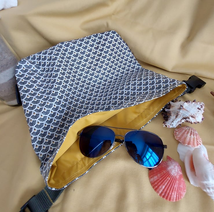 Drybag measuring 30x24cm. Depth of boxed corners are 9cm. Interior is a rubberised waterproof mustard lining with a handle inside for hanging out to dry. Outer is a coated cotton fabric. Roll top design with a webbing strap secured with a clip.
