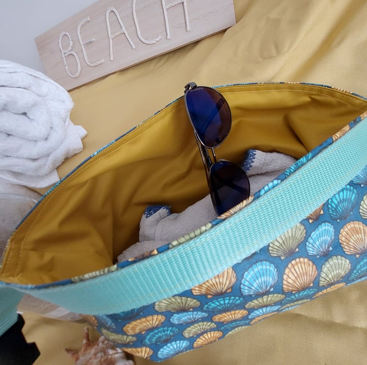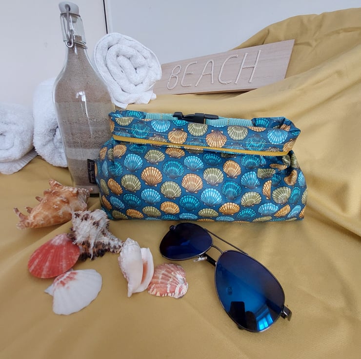 Drybag measuring 37x22cm. depth of boxed corners are 9cm. Outer is a lovely shell design coated cotton fabric. Lining is made using a mustard colour rubberised waterproof fabric, it also has a handle inside to assist in hanging out to dry after use.,rolltop design using webbing strap and secured with a clip. useful for storing wet clothing whilst travelling home from swimming etc. also useful to store reusable nappies until home.