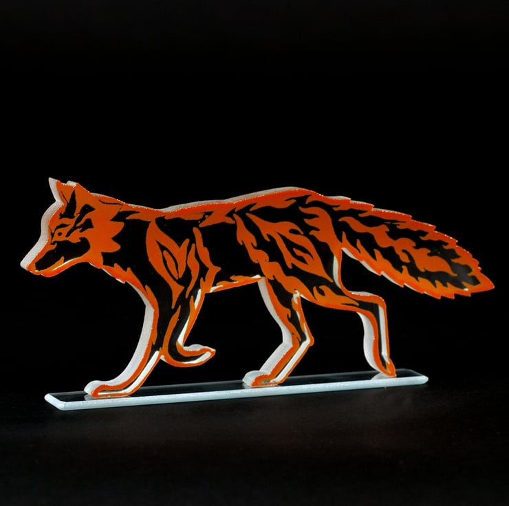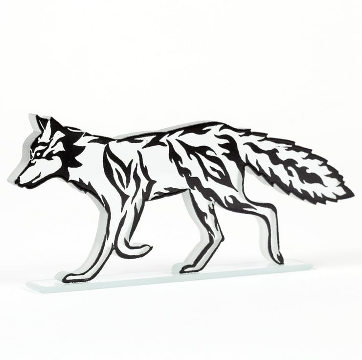 This Fire Fox glass sculpture is covered with a flames print in your choice of coloured glass enamel inspired by tribal design work.