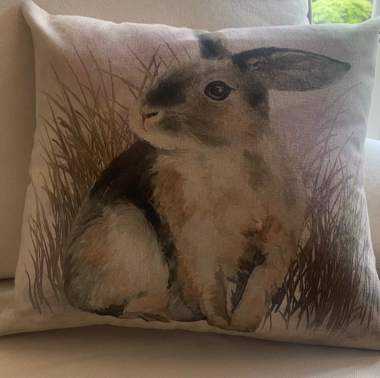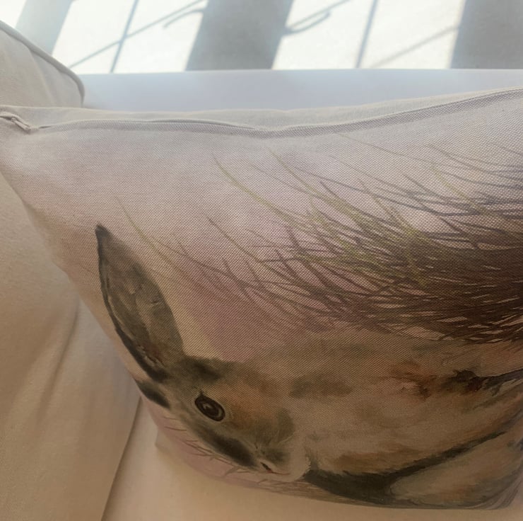 Very appealing and beautiful Rabbit Print on 100% Cotton Canvas, natural colour backing in 80% cotton 20% polyester soft canvas fabric. Measures approximately 45cm x 44cm. Concealed side zip and overlocked seams.
