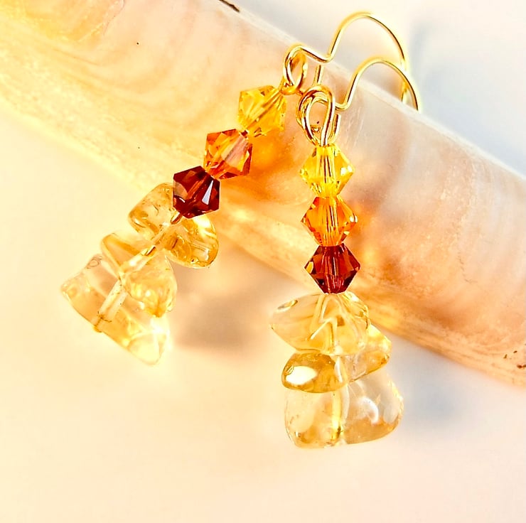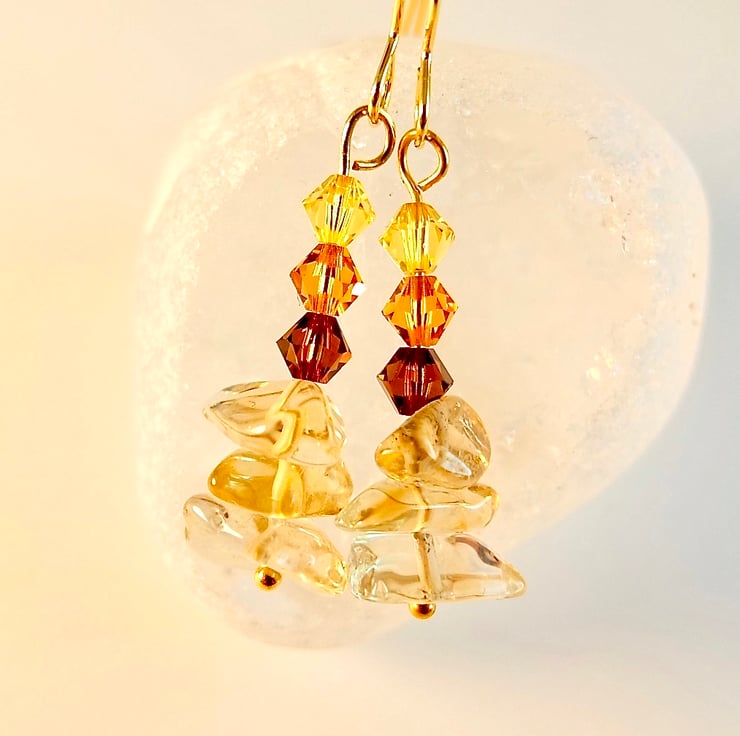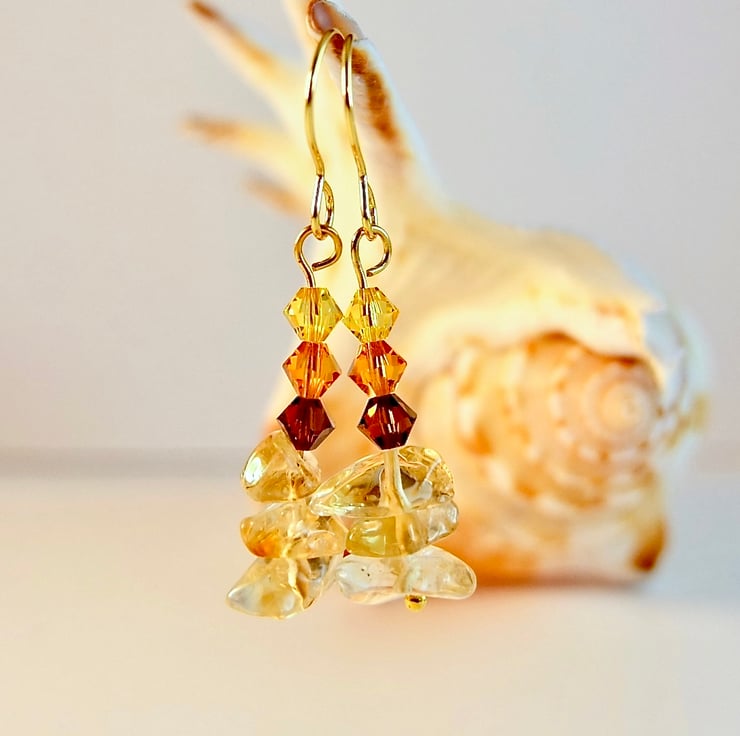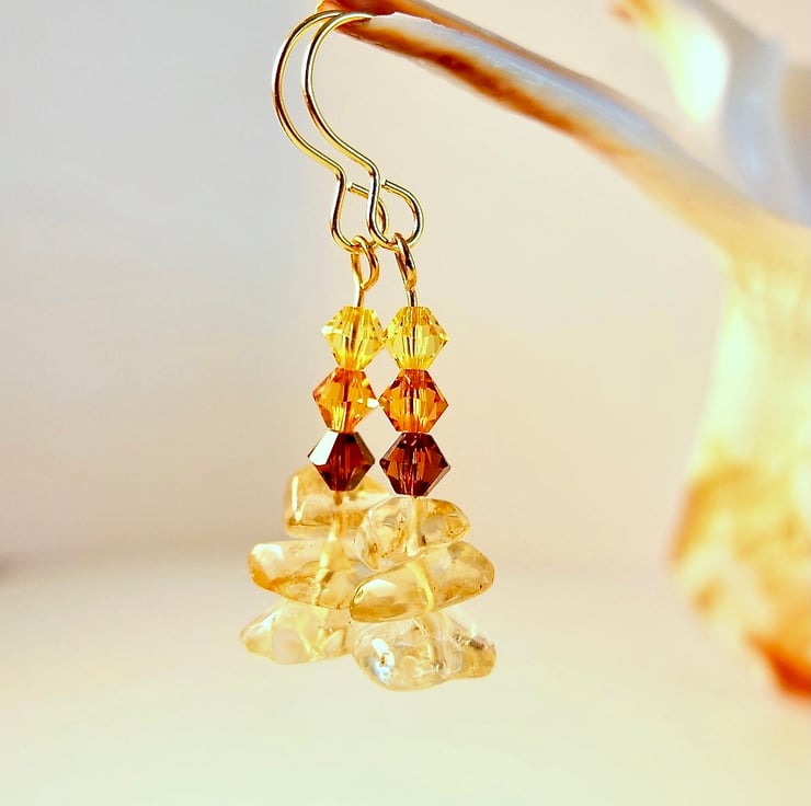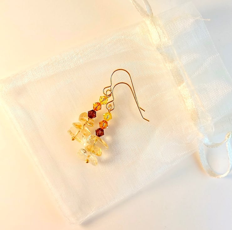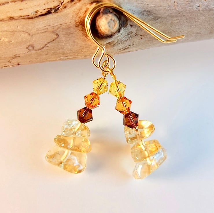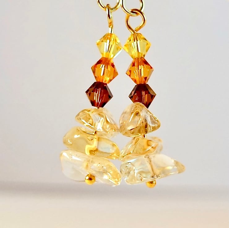 Sparkly earrings in shades of yellow, featuring a trio of lovely, translucent, pale lemon citrine chip beads topped with a trio of 4mm Swarovski Crystal bicones in the colours 'smoked topaz', 'topaz' and 'light topaz'.