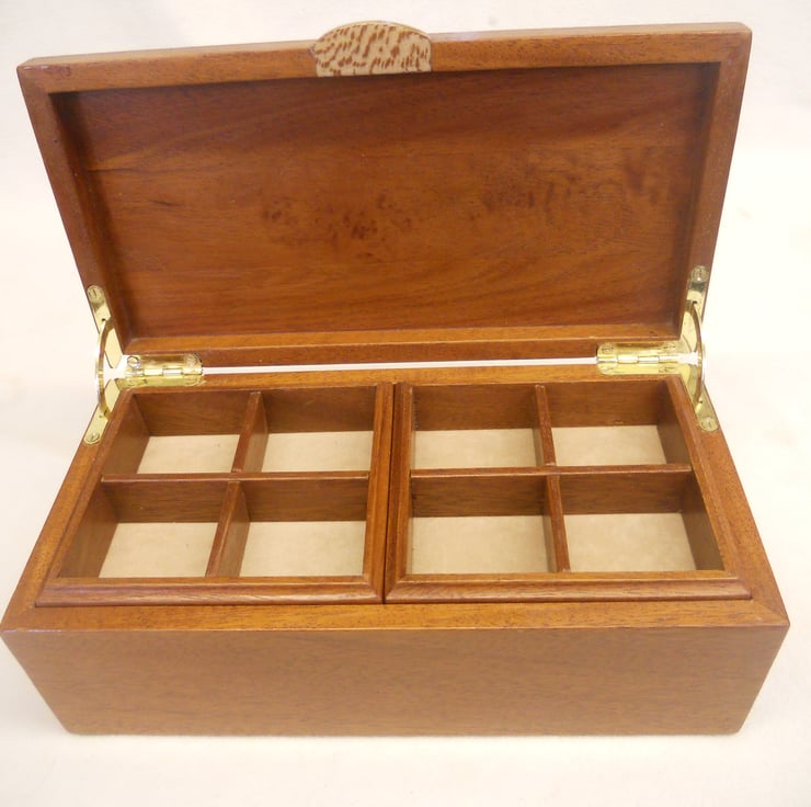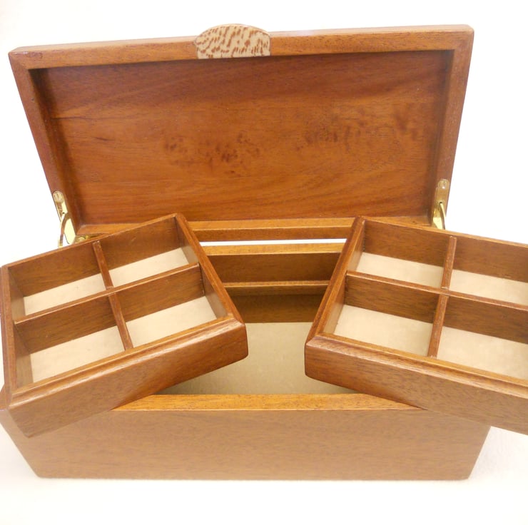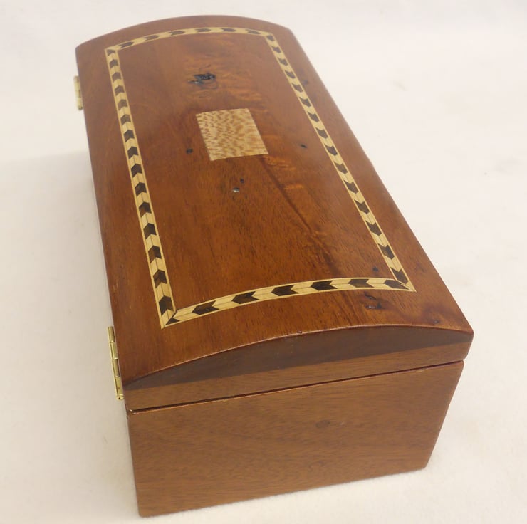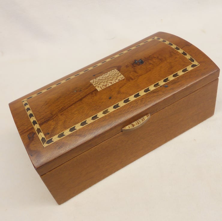 A bowed top jewellery casket handmade in reclaimed solid mahogany, inlaid and with a centre panel and lift of London plane. Please note there is a knothole in the top surface which I have deliberately included when I chose the timber,which I think adds character.