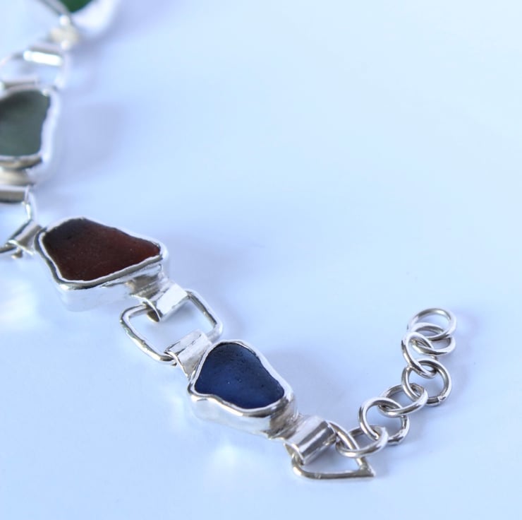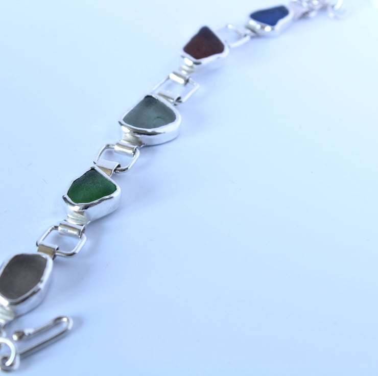 Beautifully hand made in sterling silver, this multi coloured sea glass bracelet is truly gorgeous. Each piece of glass has been hand set in a fine silver bezel. The glass is set as we find it, retaining its organically formed shape and finish.