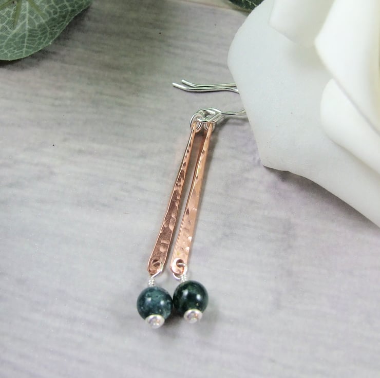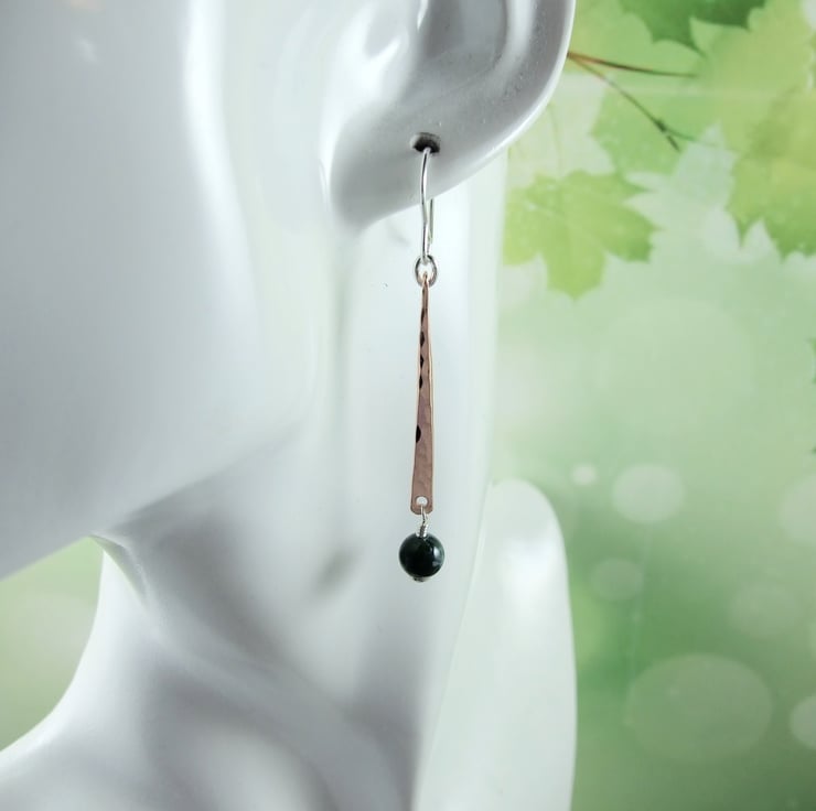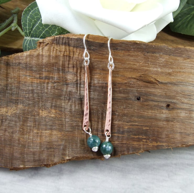 I have created the teardrop shapes from copper wire and textured them with a hammer. To these I have added sterling silver ear wires and some 6mm moss agate beads. All fittings are sterling silver.