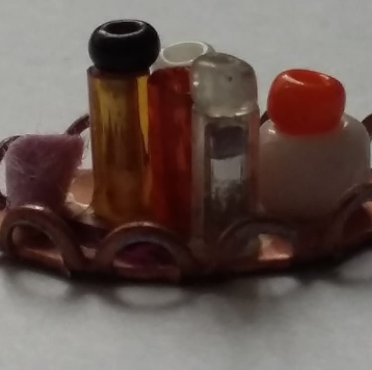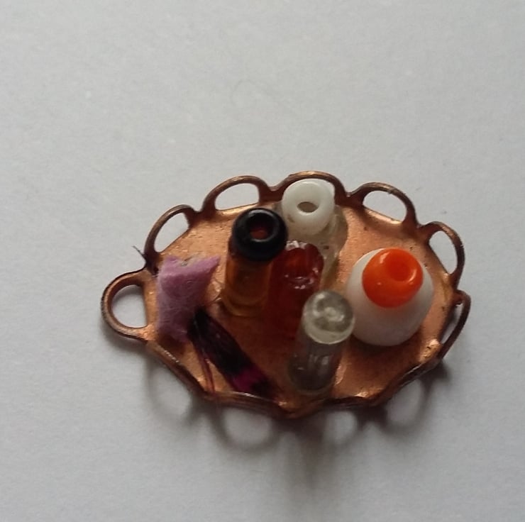 A CUTE 1.24TH DRESSING TABLE TRAY WITH PREFUME BOTTLES.THE TRAY IS METAL AND THE BOTTLES MADE WITH BEADS