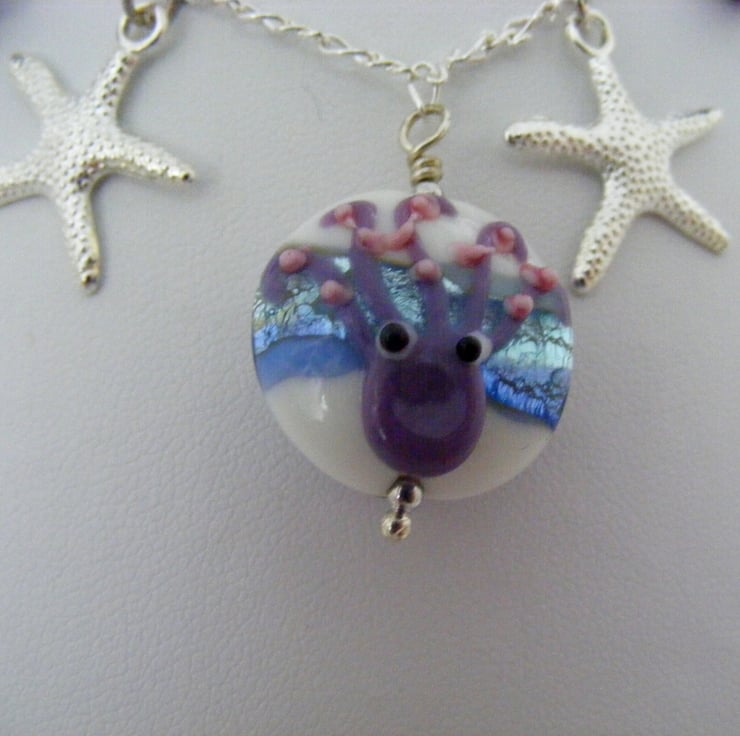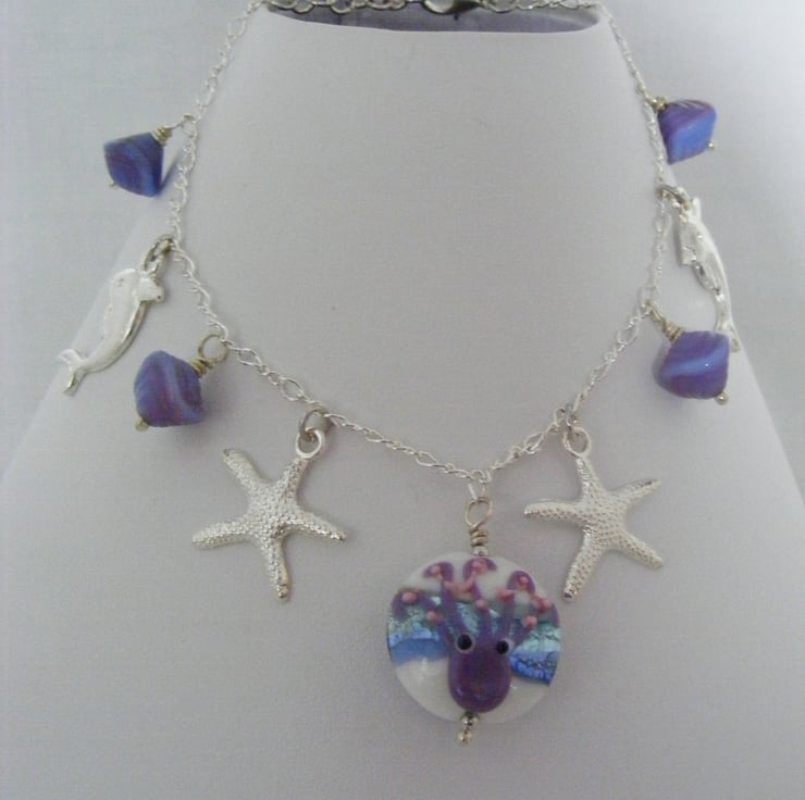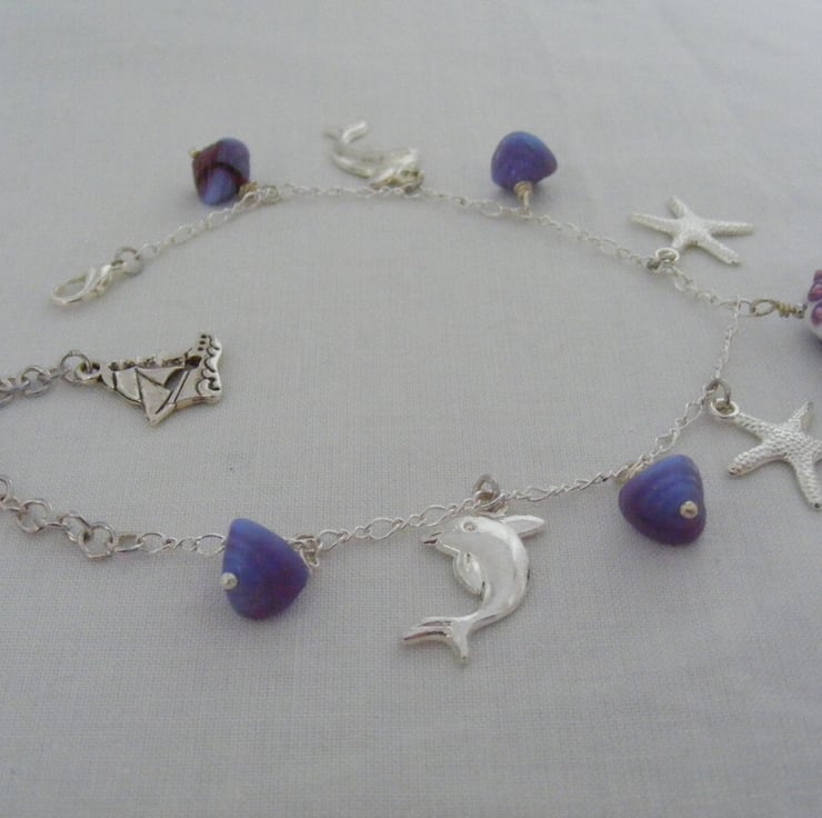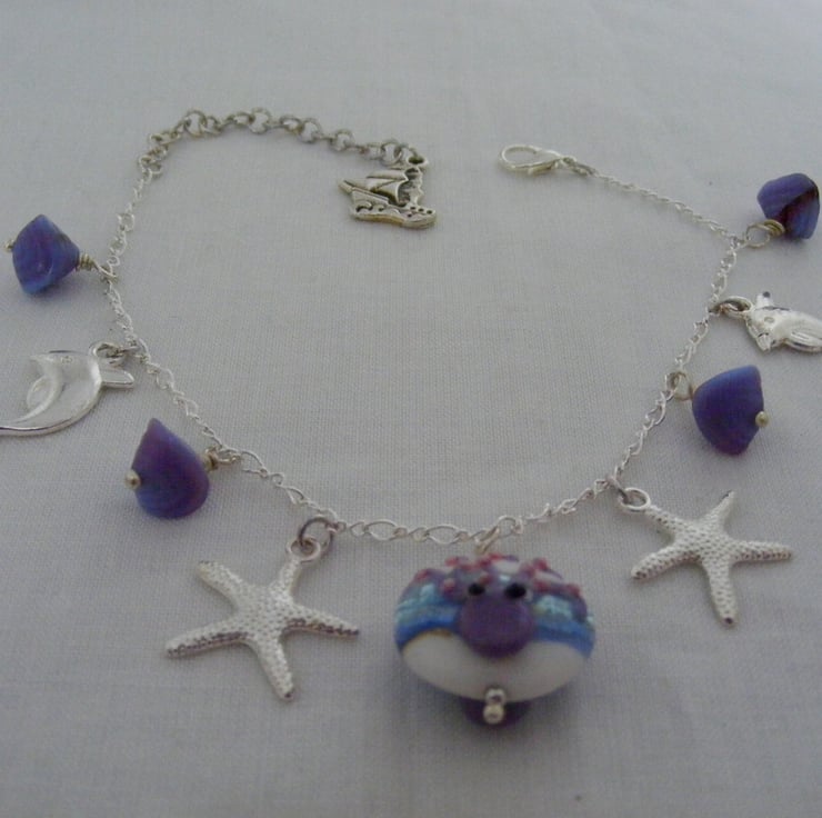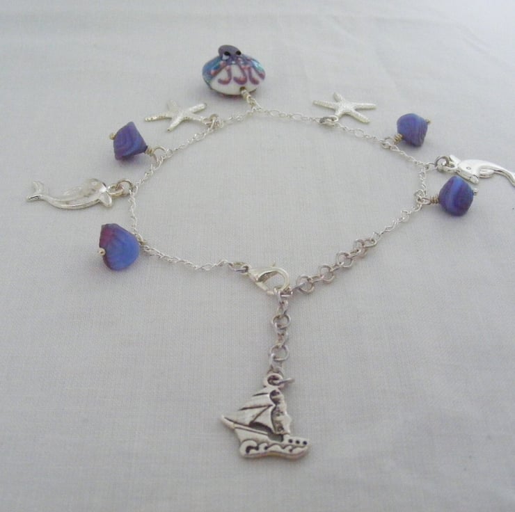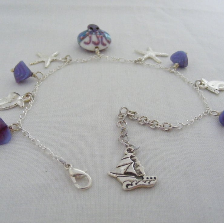 A lovely sea charm anklet handmade using, 1 x 18mm octopus lampwork coin bead. Octopus sits on both sides of the bead. 10mm mauve and light blue shell glass beads, 22mm silver plated dolphin charms, 20mm silver plated starfish charms, 18x18mm silver plated yacht charm, Silver plated chain, headpins, lobster clasp and extension chain.