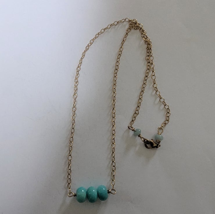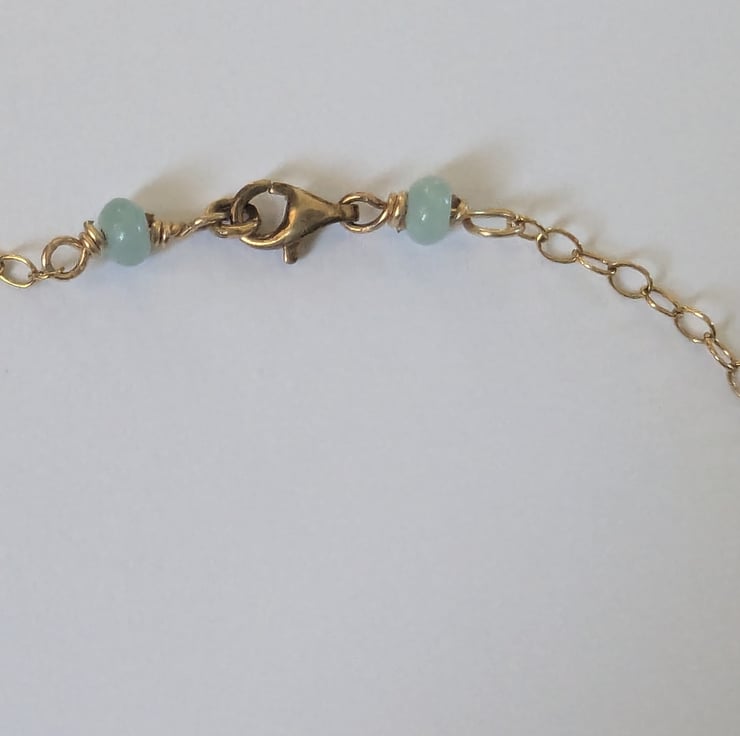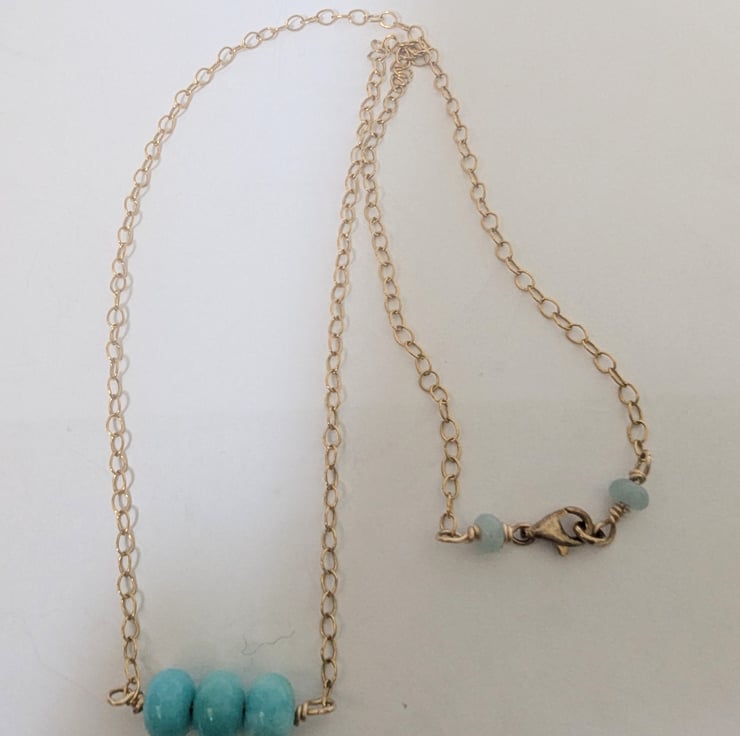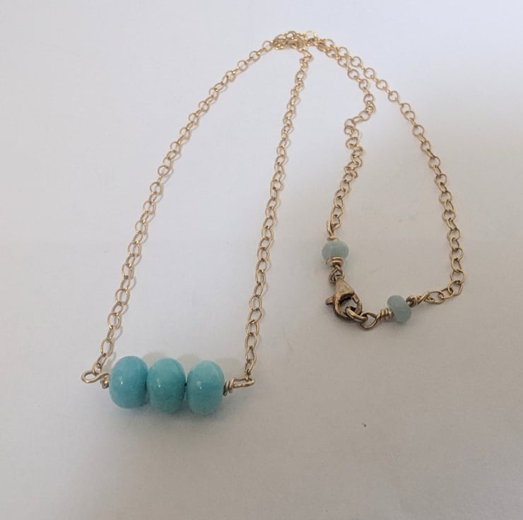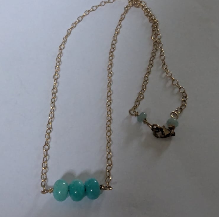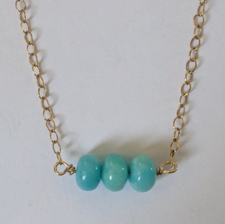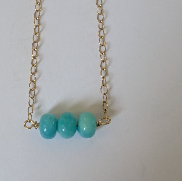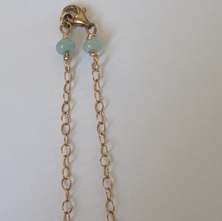 I have used lovely Peruvian Amazonite beads strung onto gold wire and hanging from a gold chain to create this necklace. It is finished with two smaller Amazonite beads and a gold clasp.