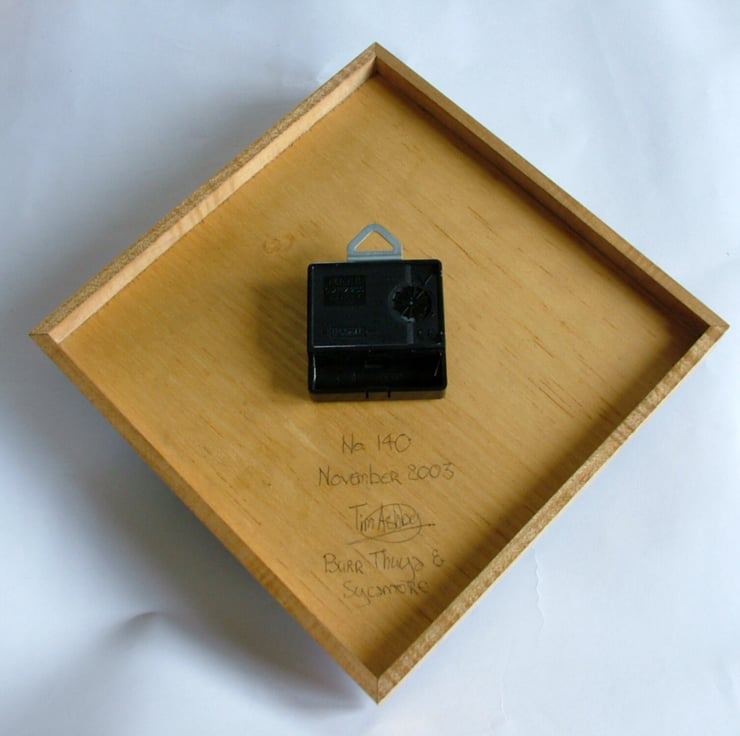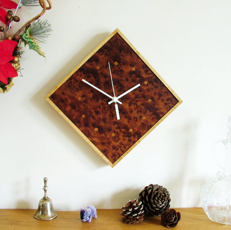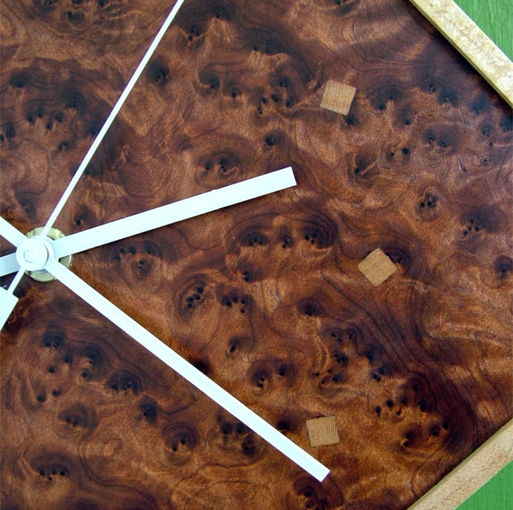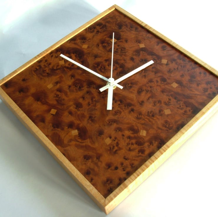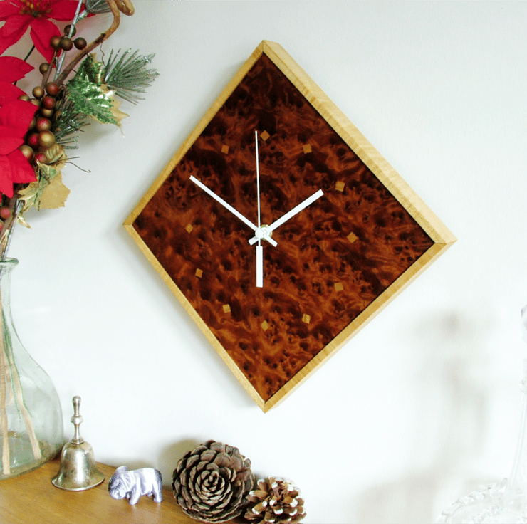The inspiration for this clock originated with an exploration of how time could be displayed on beautiful timbers resulting in the inlaid diamond hour markers made from sycamore that contrasts with the burr thuja.