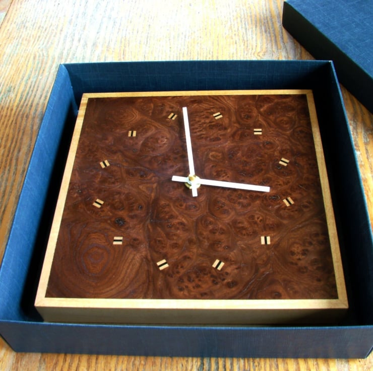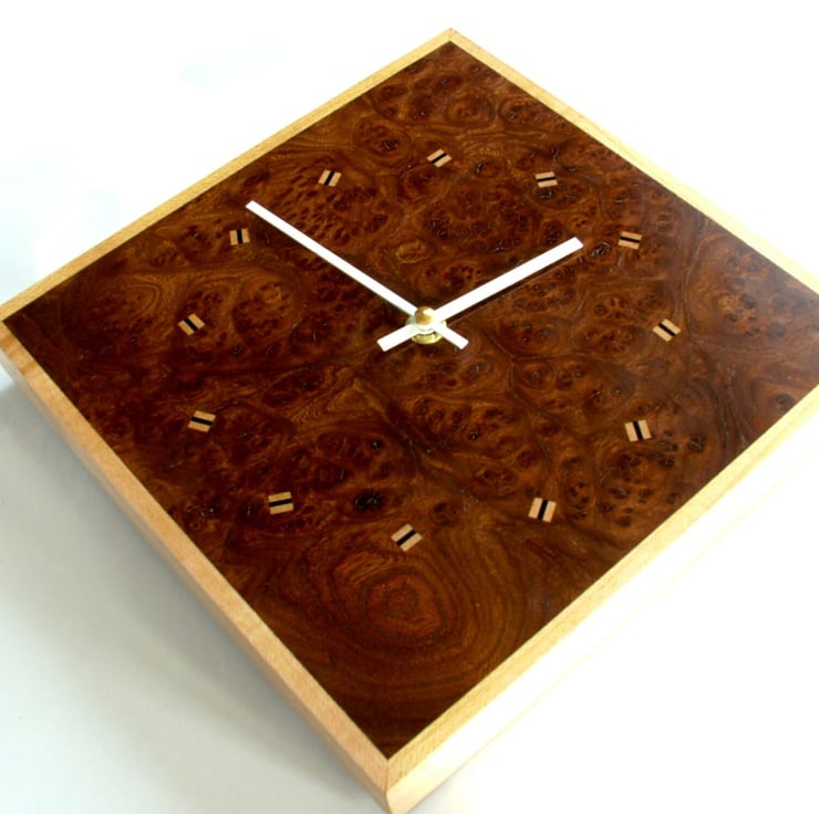 The inspiration for this clock originated with an exploration of how the time could be displayed on beautiful timbers resulting in the (Liquorice Allsort) inlaid square hour markers made from striped sycamore and ebony.