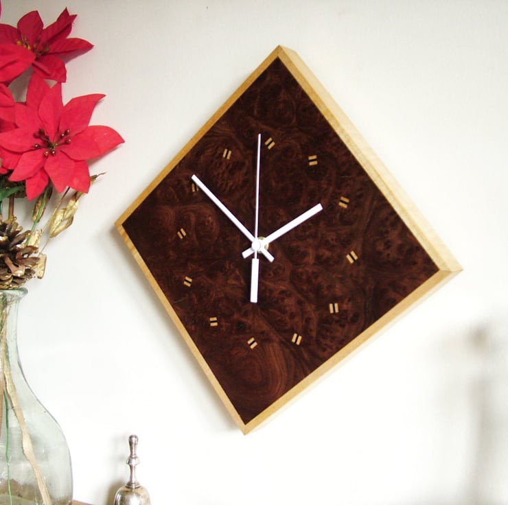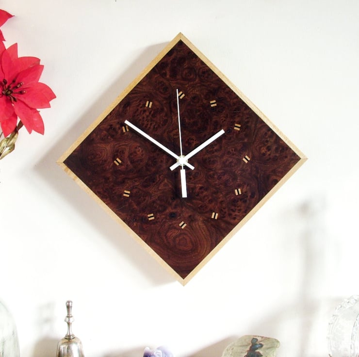 Diamond Wooden Wall Clock - handmade with burr brown oak, sycamore and old ebony