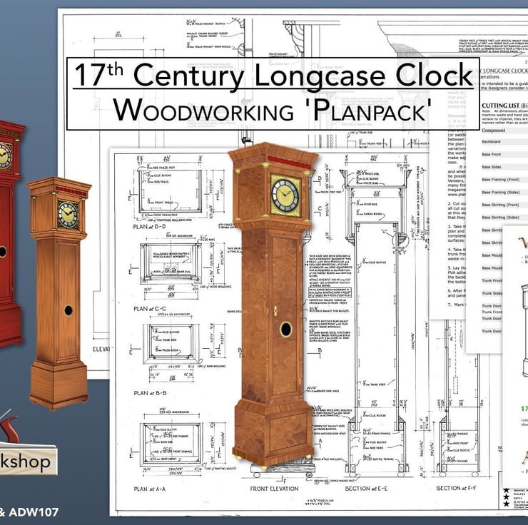 This Ashby Design Workshop Planpack comprises a Colour Front Cover, Schedules of Operations (Building Instructions) a Cutting List (Bill of Materials) and two A1 size Plan Sheet. Standalone metric and imperial dimensions are used. Click the thumbnail images to view timber variations for these Longcase Clock Plans.