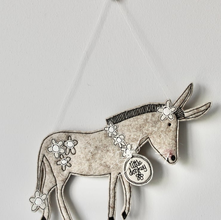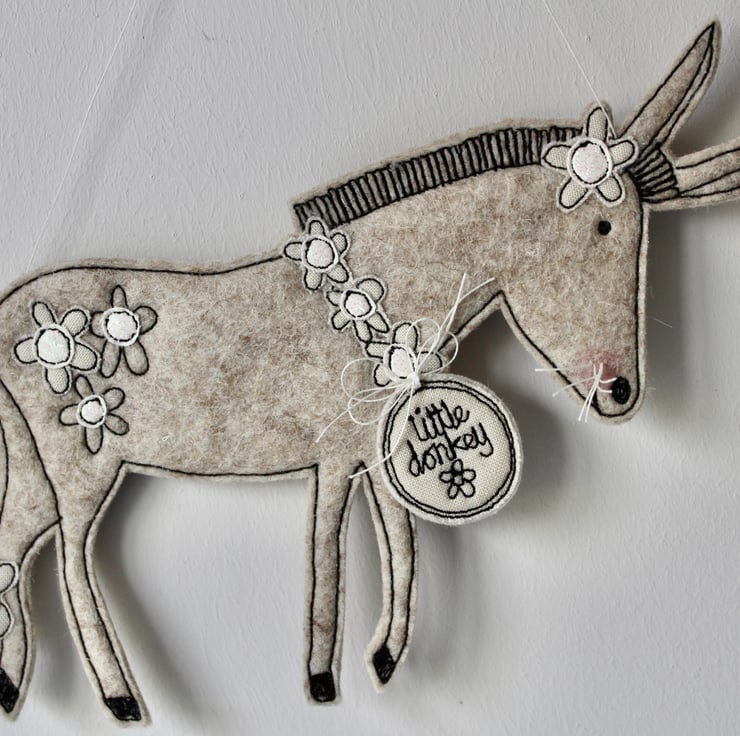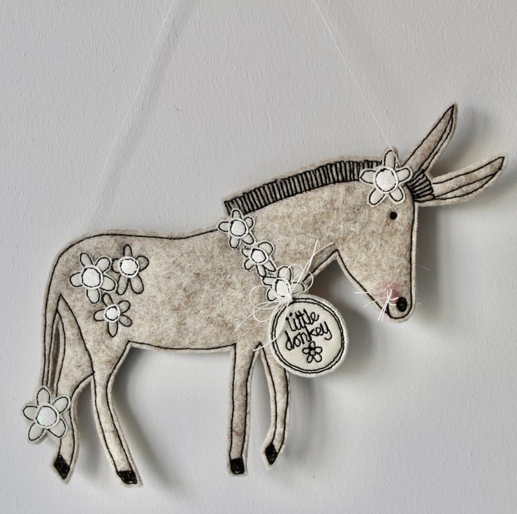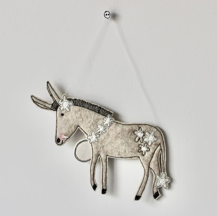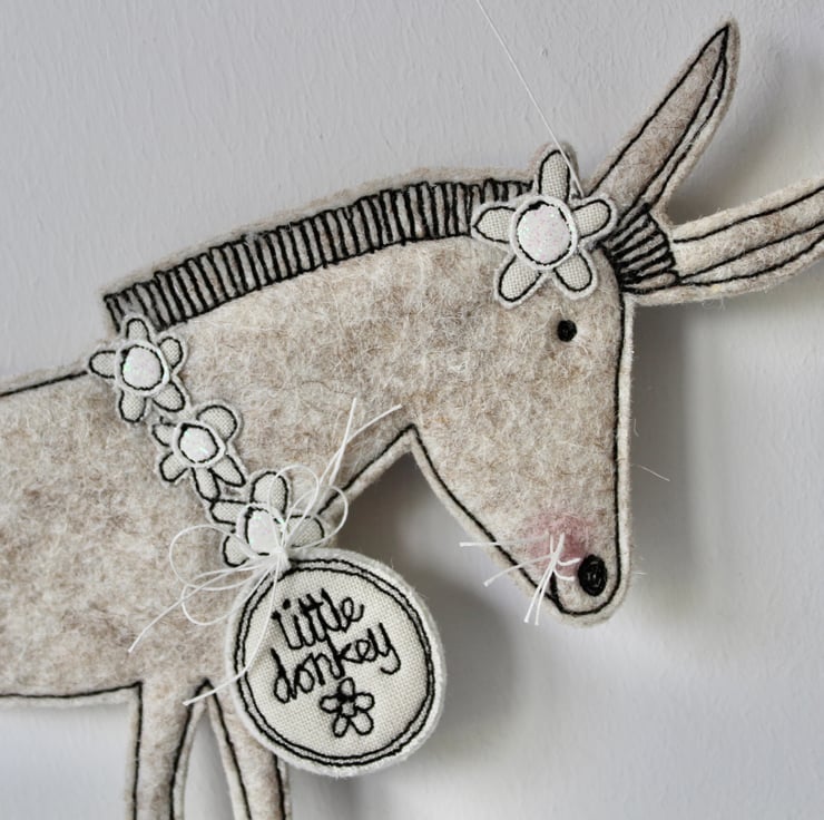 Donkey is sewn using 100% wool felt, cotton cloth, glitter cloth and free hand machine embroidery; multiple layers of cloth are sewn together and cut out by hand using sharp scissors. With a linen string to suspend.