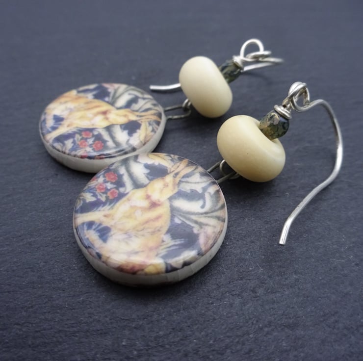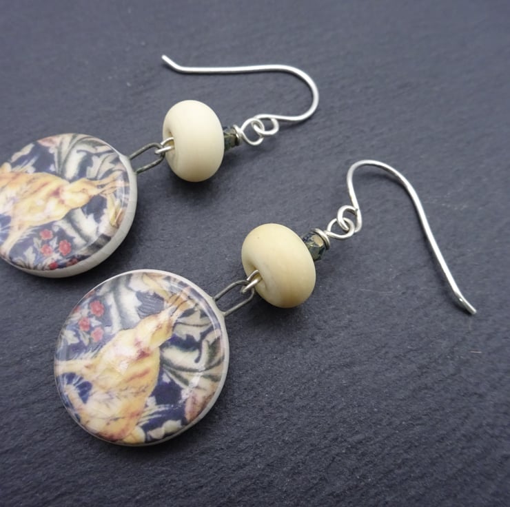 A pair of earrings made with handmade sterling silver ear wires, handmade lampwork glass beads and handmade ceramic hare drops.
