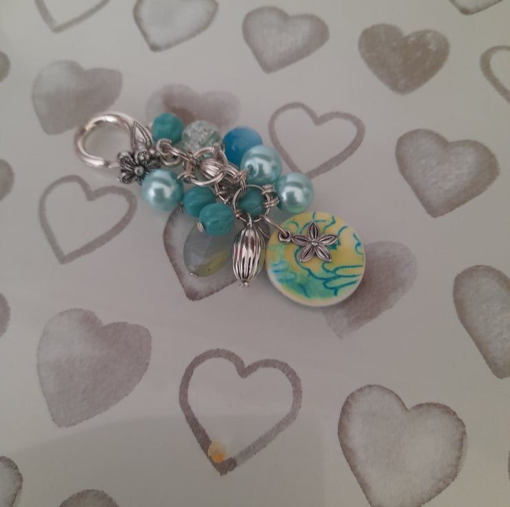 THE HANDBAG CHARM HAS BEEN MADE USING A SINGLE HANDMADE POLYMER CLAY DISC IN SHADES OF GREEN, TURQUOISE AND PALE BLUES, ALONG WITH SILVER COLOURED ASSORTED CHARMS AND A SELECTION OF GLASS BEADS AND GLASS PEARLS IN SHADES OF GREENS, TURQUOISE AND BLUES AND FINISHED WITH A LARGE FANCY SINGLE LOBSTER CLASP.