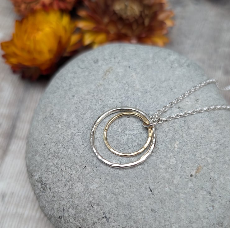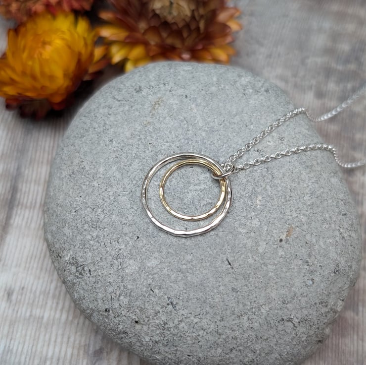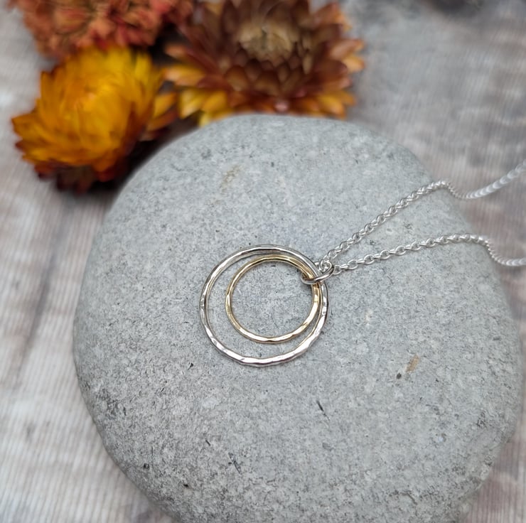 Recycled Sterling Silver and Gold Hammered 2 Circle Necklace