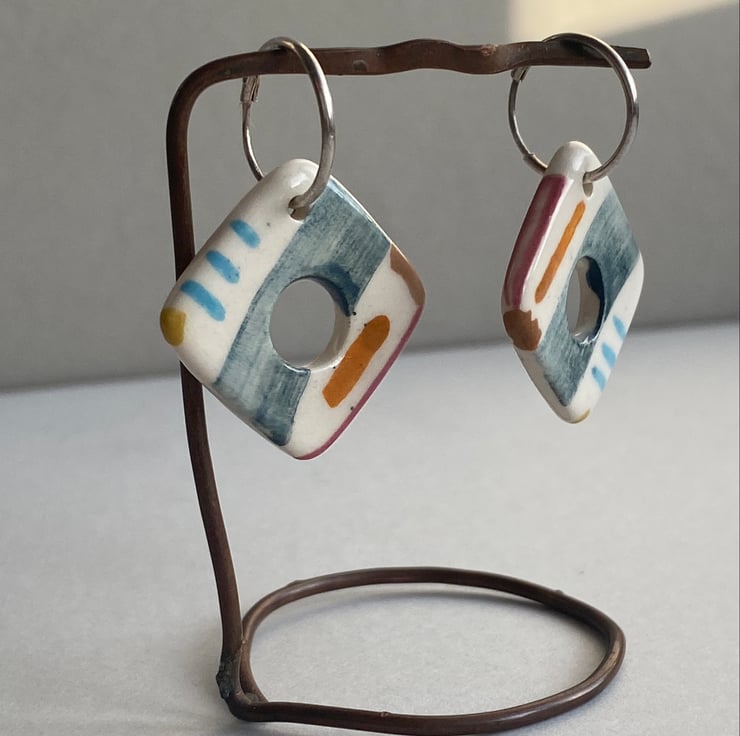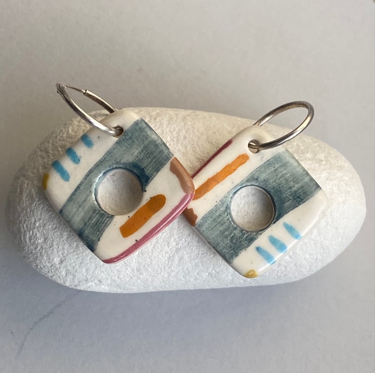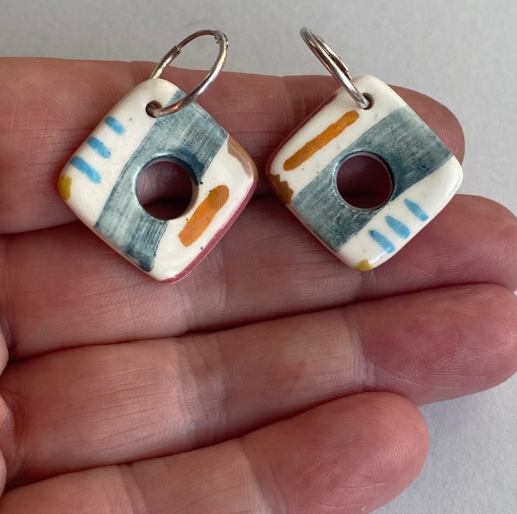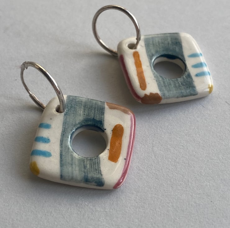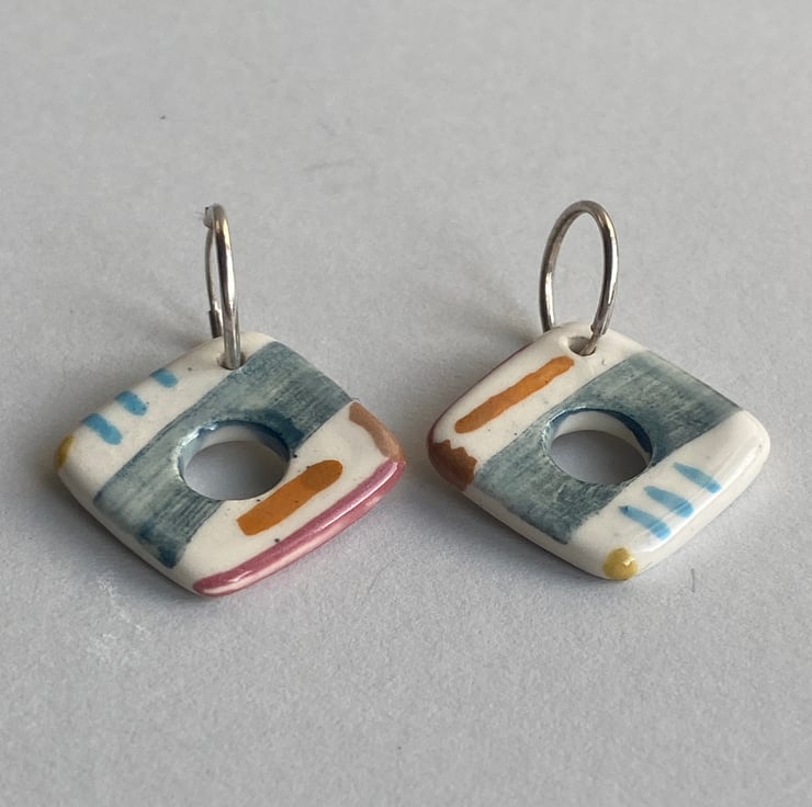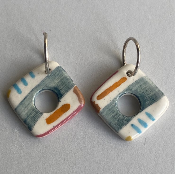 These Square earrings are hand formed using Earthenware Clay before being painted using a mixture of Clay slips and Underglazes. Varying Blues, Orange, Yellow and Deep Pinks are applied to the front and sides of the earrings giving a cool Coastal Vibe.
