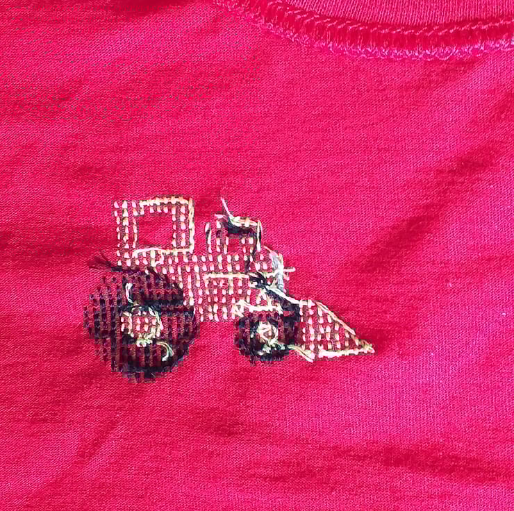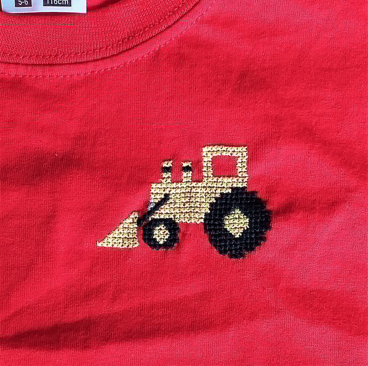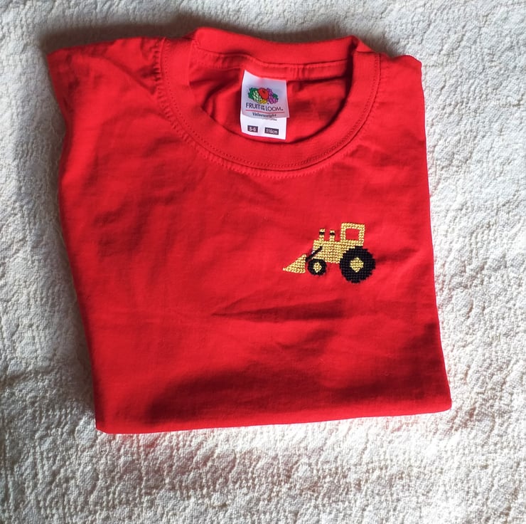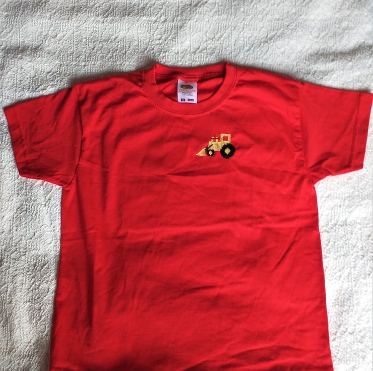 Kids love diggers! I have hand stitched a yellow digger on the left front of this scarlet, short-sleeved T-shirt by Fruit of the Loom. As I never use a backing material when embroidering children's clothing, there is nothing inside the shirt to irritate your child's skin. The shirt is all cotton and can be machine washed, though, due to its deep red colour I would suggest a cool wash at least for the first few washes!