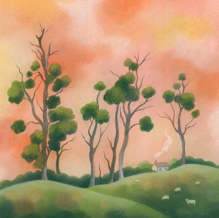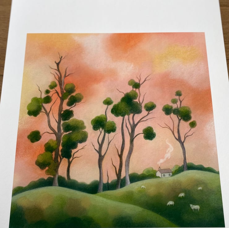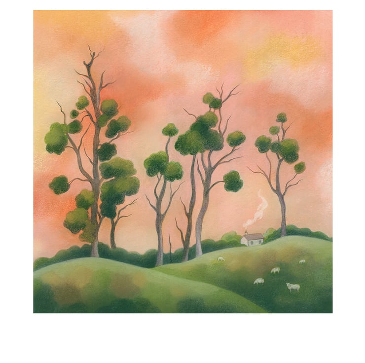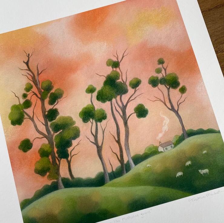 I used chalk pastels and coloured pencils to create this atmospheric drawing of the English countryside. I love mistletoe growing in trees and beautiful orange skies!