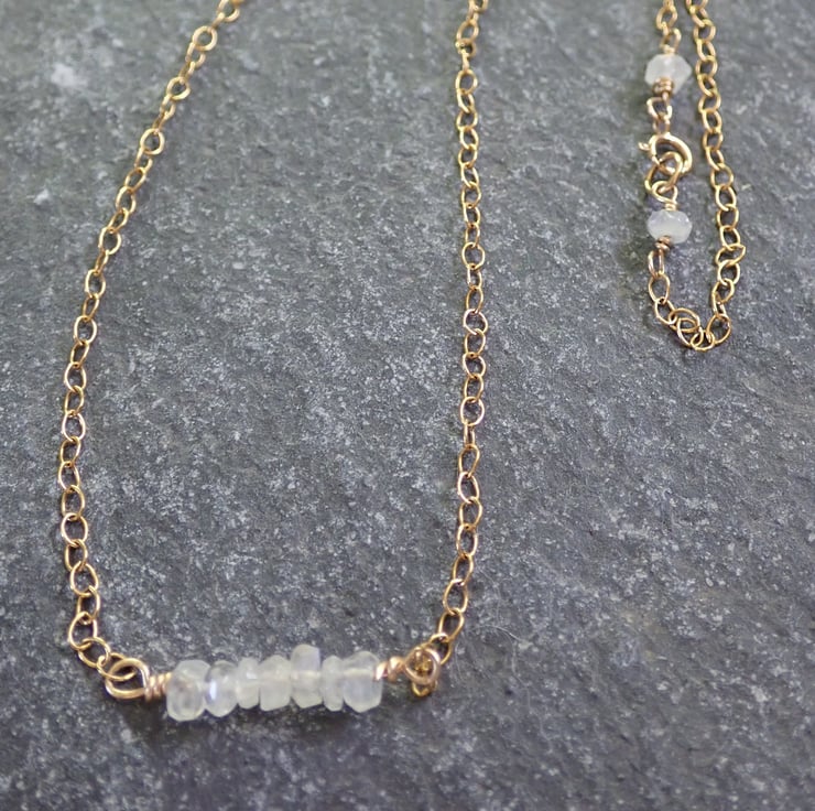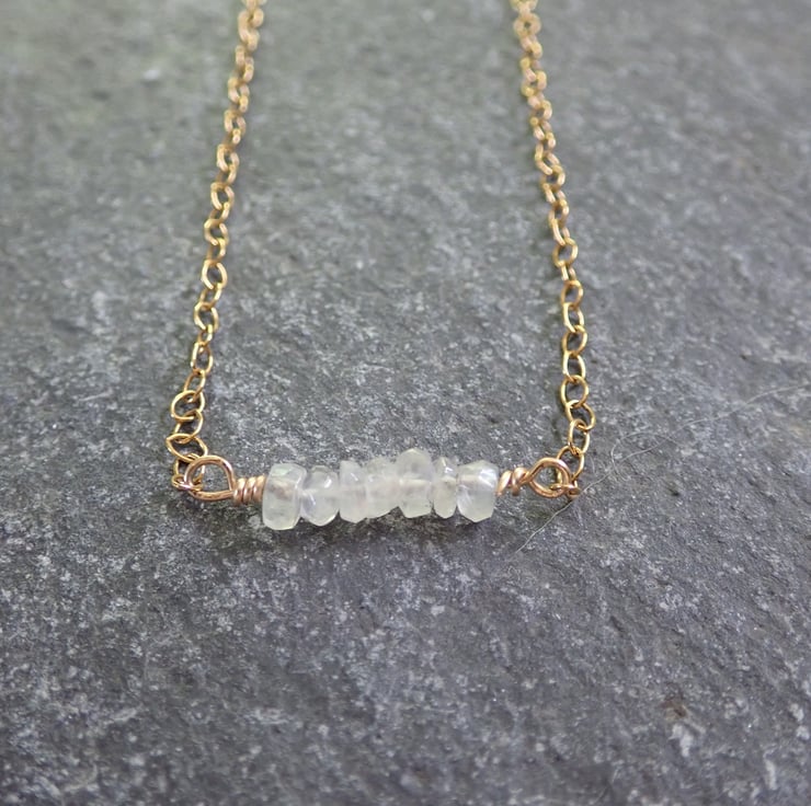 I have strung these beautiful moonstone beads onto a gold wire and hung them from a fine gold chain. The beads measure approximately 4.5mm and the chain is around 16 inches long.