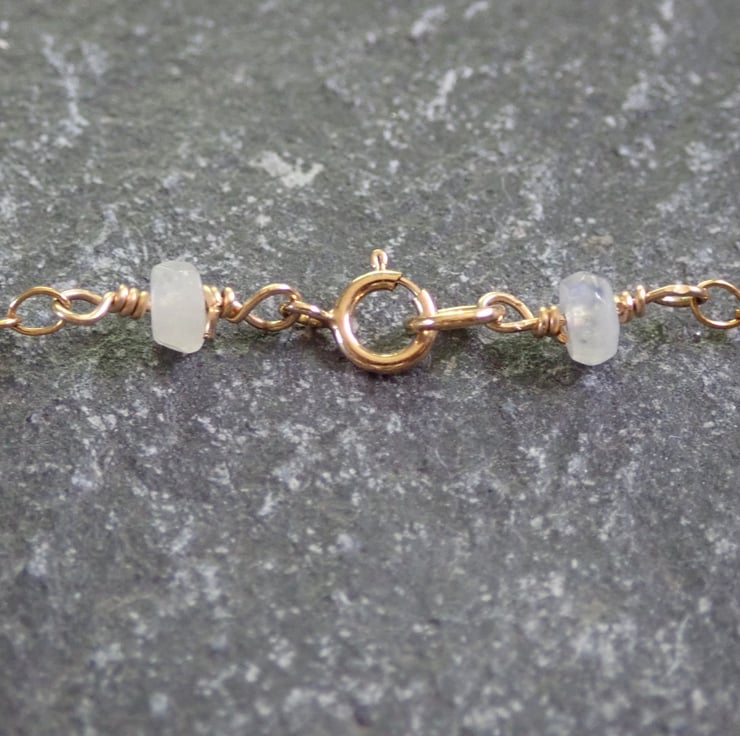 I chose these moonstone beads as I love the way in which they sparkle as they catch the light and contrast with the gold. This would look particularly lovely layered with a gold chain.