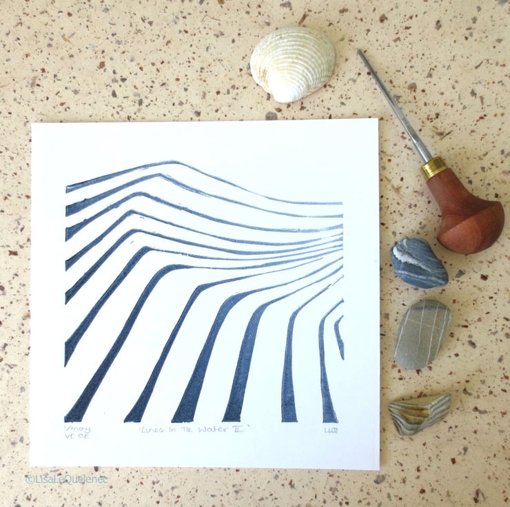This is the second image in a series called 'Lines In The Water', prints from the other editions are available in my store. A contemporary print showing the flow of waves and water observed at the water's edge. This is an open and varied edition of prints that are printed in different watery colourways as can be seen in group photographs and is part of an ongoing series. The print in this listing is in shades of a dark denim colour.
