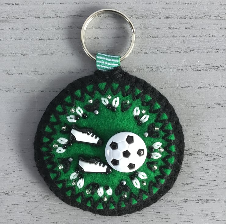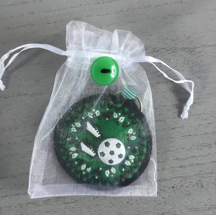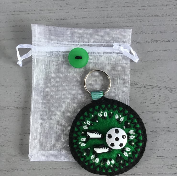 This Hand Embroidered Football Keyring or bag charm is gift wrapped in an organza bag, decorated with a green button. A perfect bespoke gift for anyone who likes to play or watch football.....for a birthday, friendship, thank you, housewarming or Christmas gift. It’s light to post…….. so makes an ideal letterbox gift to post.