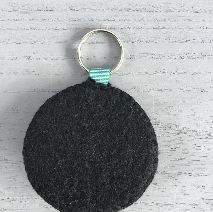 This Hand Embroidered Football Keyring is 2.50 inches (6.50 cms) in diameter. It has a metal split ring, secured with ribbon at the top....so it’s ready to attach a key or, to put onto a sports bag.