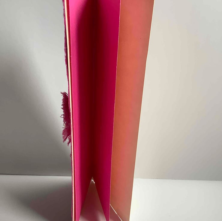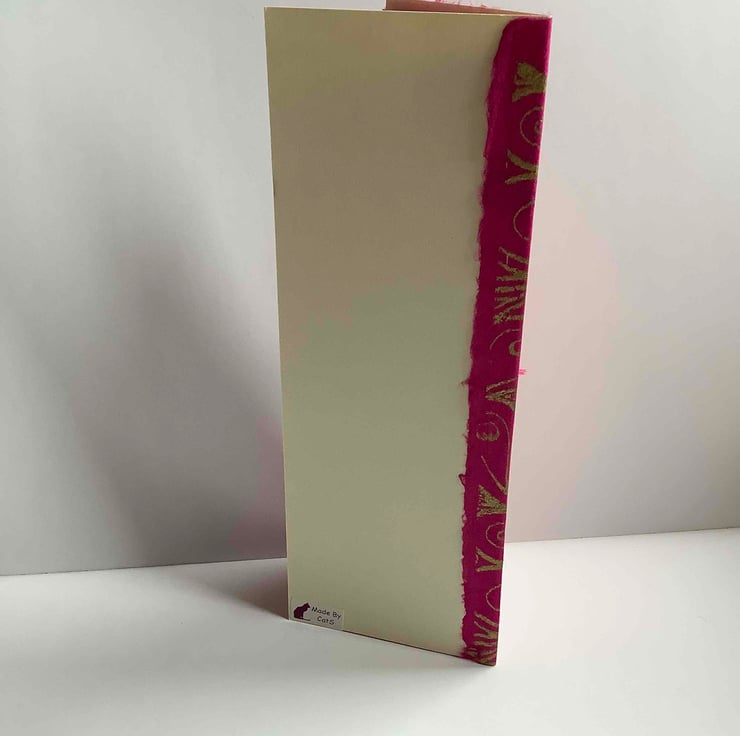 This is a handmade card which is blank for your own message. The card and envelope are ivory and the insert is pink.
