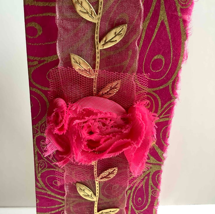 The pink and gold paper on the front has been torn at the edges for a softer look. There is a description of where this paper was made in the photos