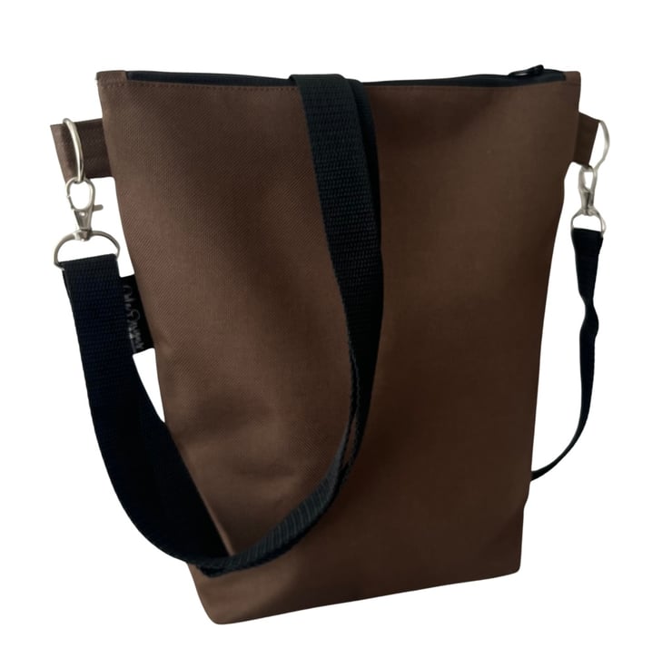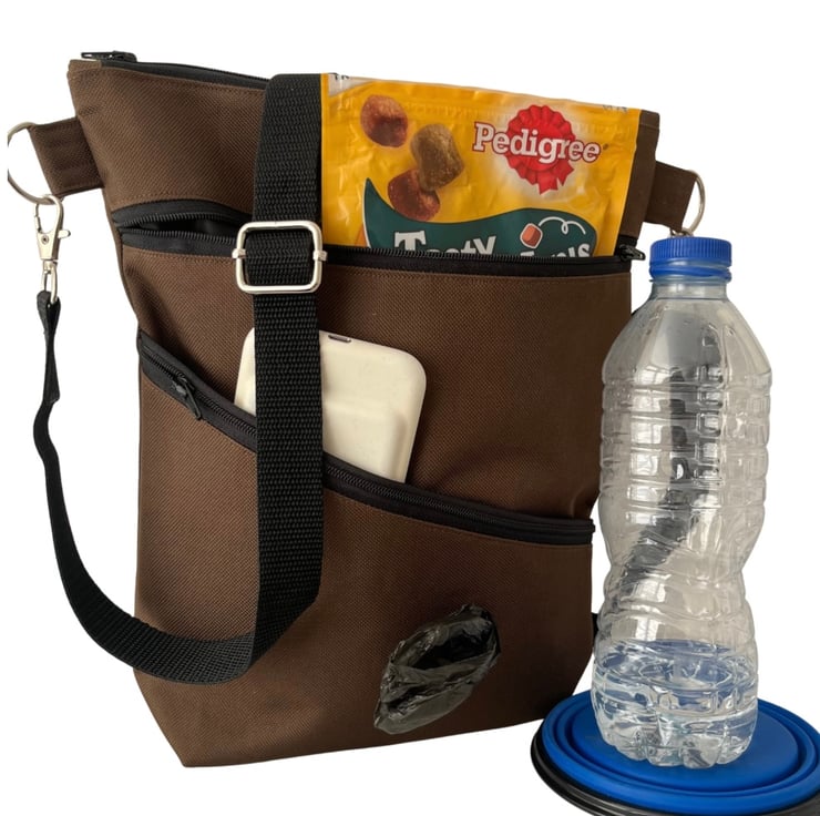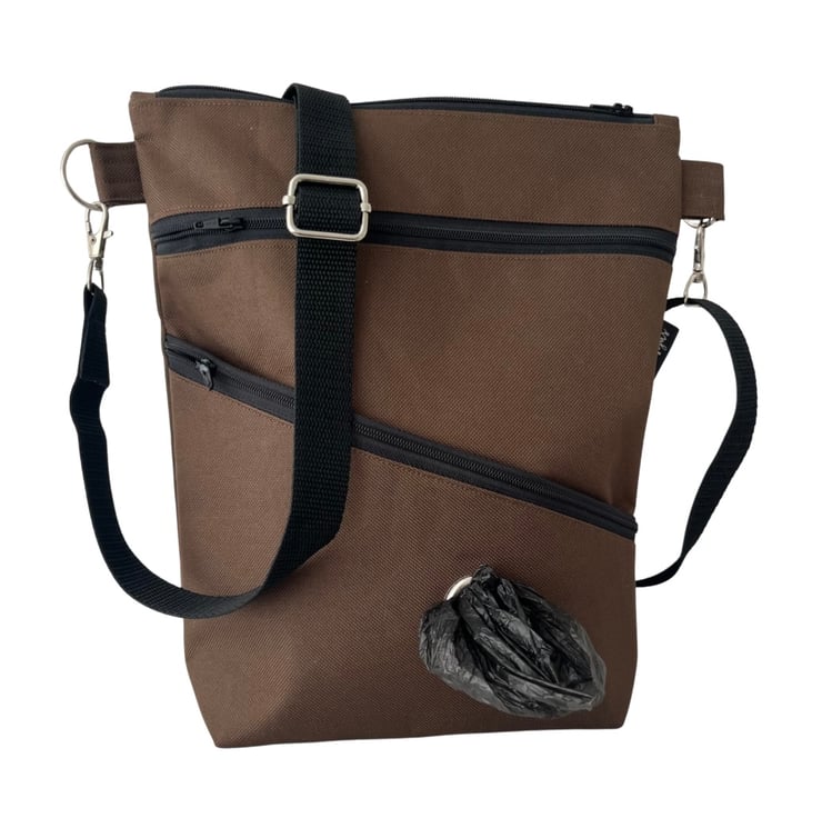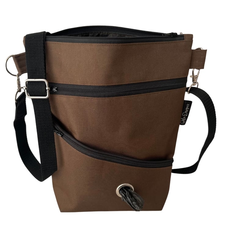 This chocolate brown Dog walking bag is lined with a black waterproof nylon lining. This handy bag will hold all your essentials for walking your dog.