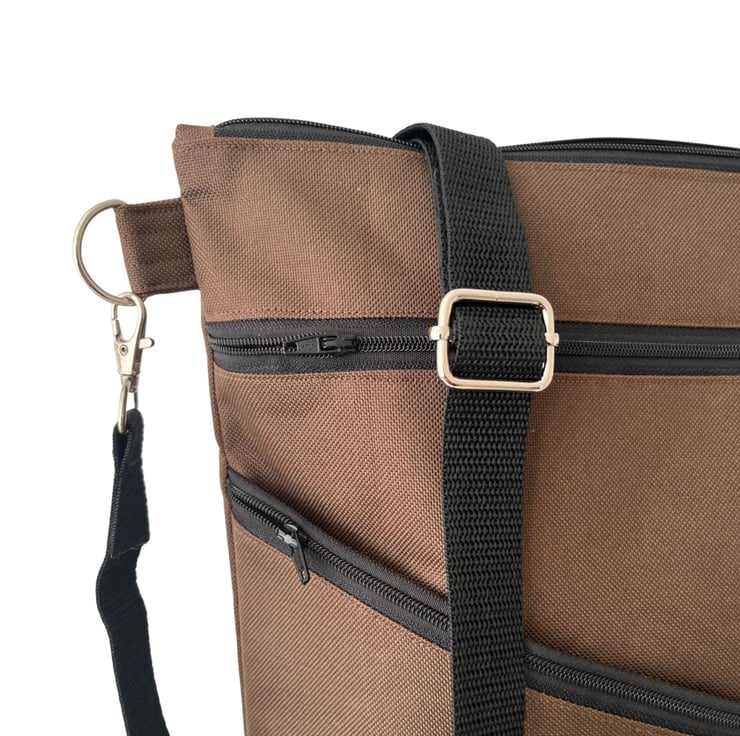 The strap is a waterproof polypropylene and is adjustable up to approx 150 cms ,with detachable metal swivel connectors, making it easy to change strap if needed without replacing the whole bag, The strap can also be adjusted to wear the bag around your waist.