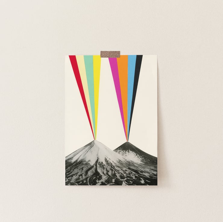 I found a photo of twin volcanos and wanted to create a bold image to portray the immense power volcanos exude. Strong stripes in deep colours formed a rainbow effect which resulted in a colourful print which makes people smile.