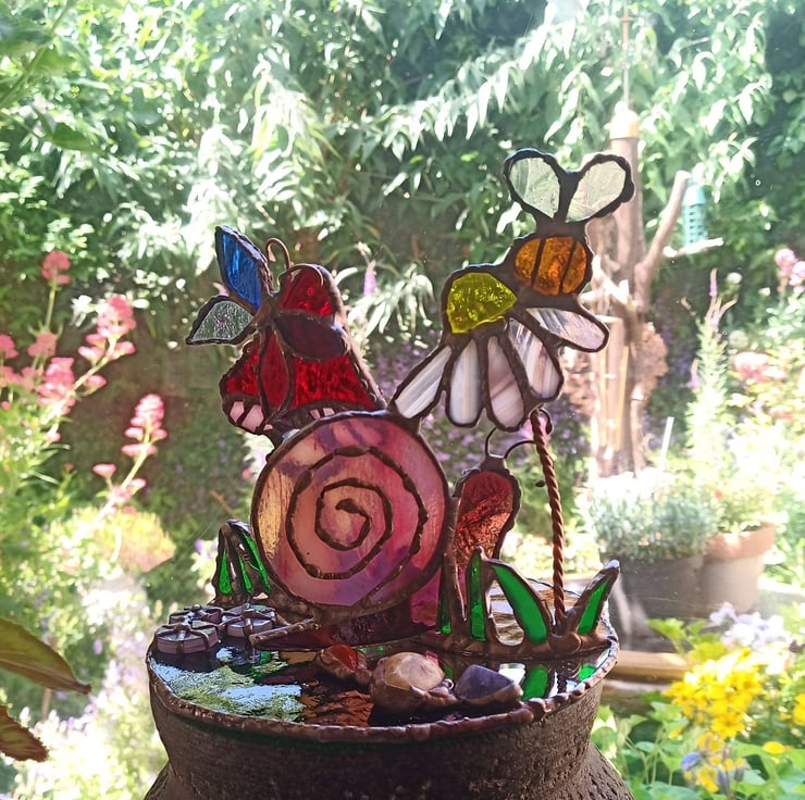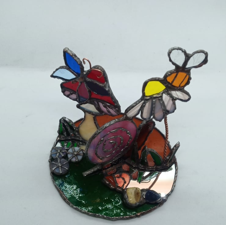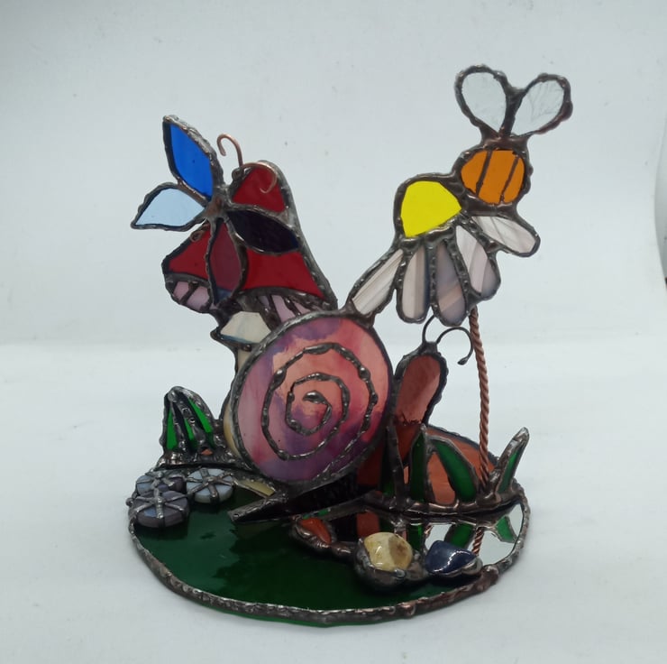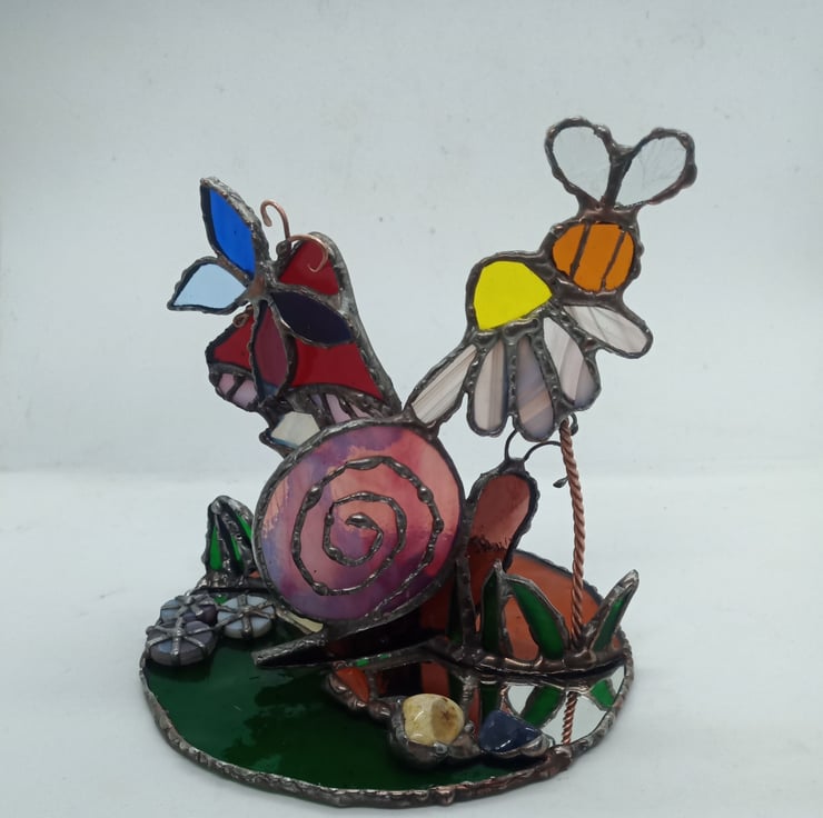 This delightful ornament depicting a walk up the garden path has a green and orange base with a path of mirrored glass, a pink and purple snail, a red toadstool complete with a blue butterfly and a daisy with a bumble bee perched on top. Looks great in the garden, on a window sill or on a table under a lamp or with a tealight. The perfect gift for nature lovers, gardeners or to celebrate a third wedding anniversary.
