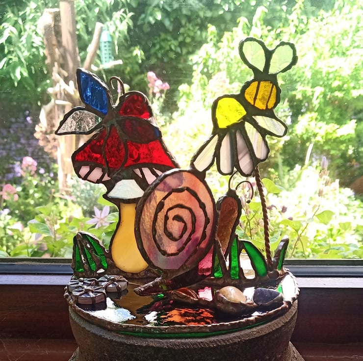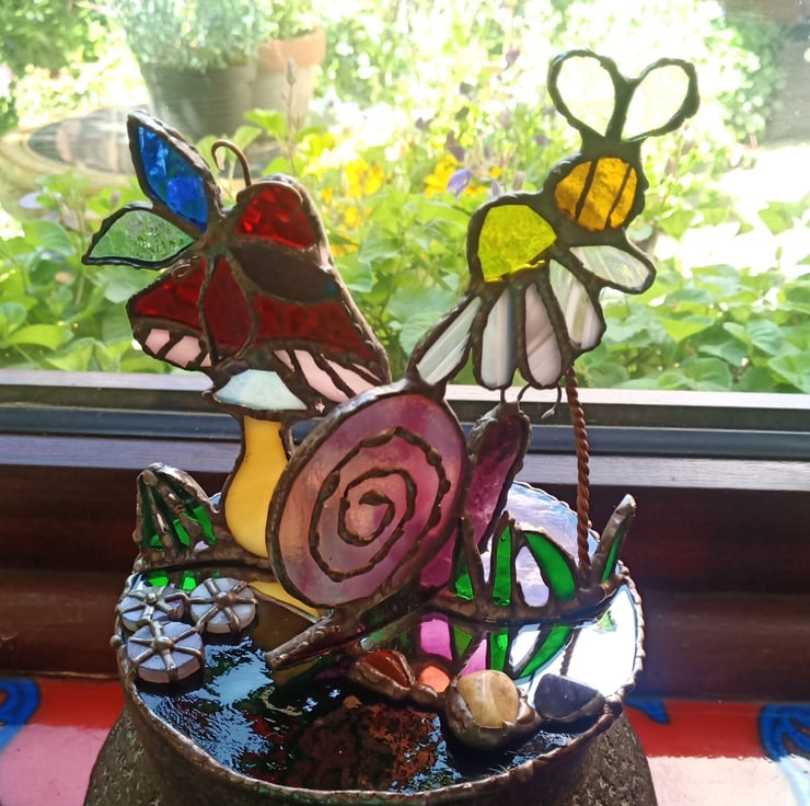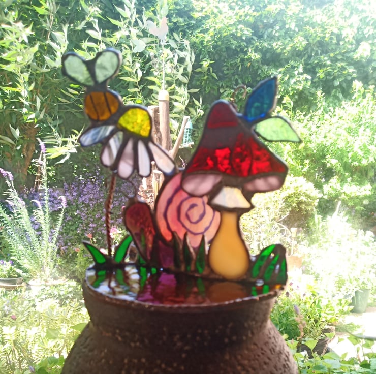 Made in the Tiffany Style each piece of glass has been hand cut, smoothed and copper foiled before being soldered together. The flower has a twisted copper wire stem and blades of green glass grass, pink and white flowers and polished stones along the path add an extra dimension. Finished with decorative solder and polished to shine to bring out the highlights.