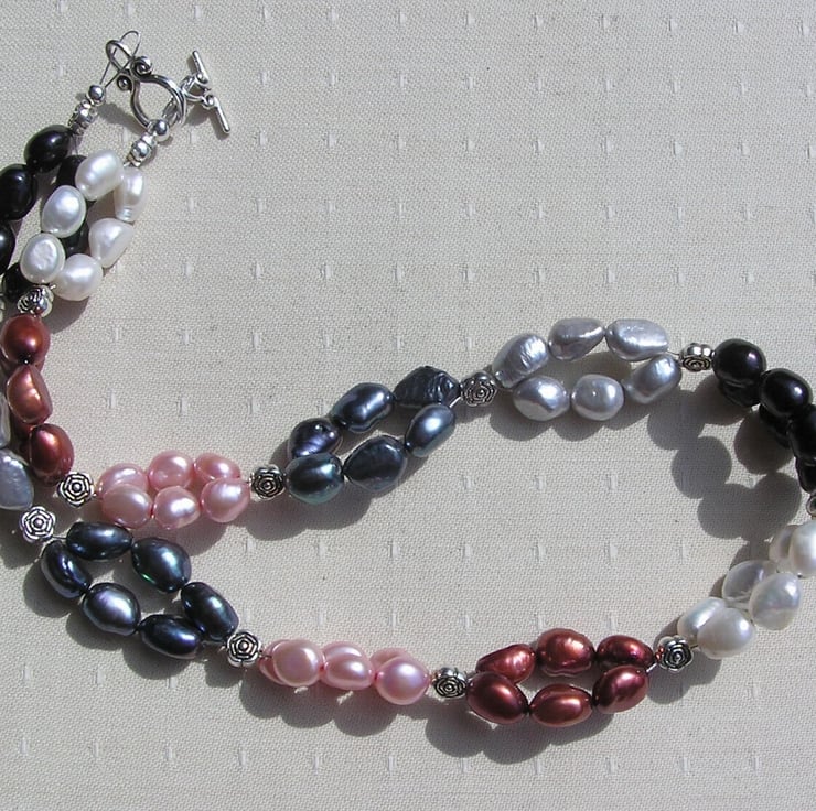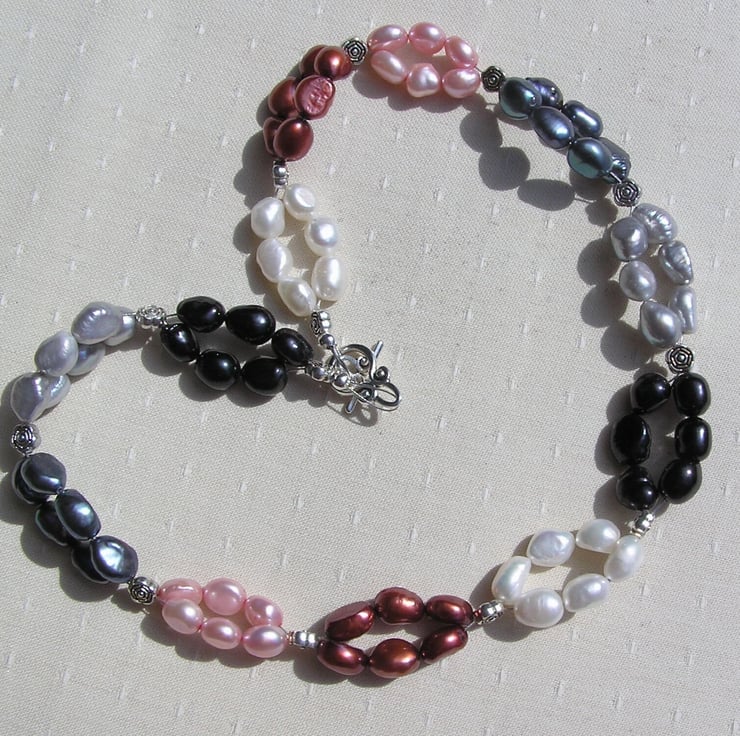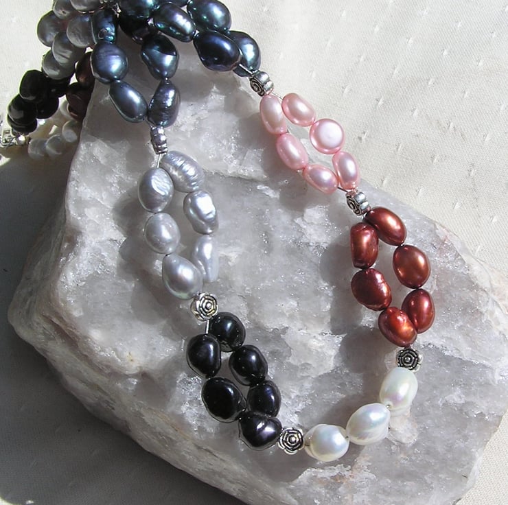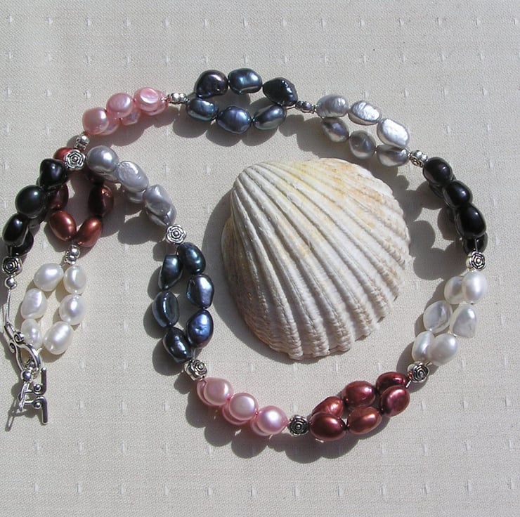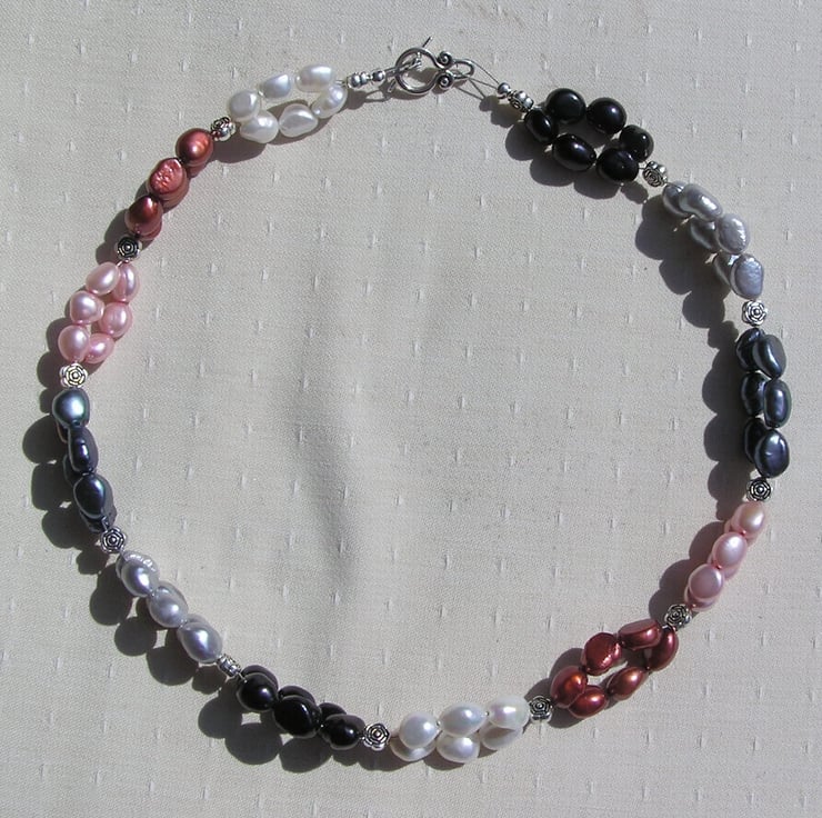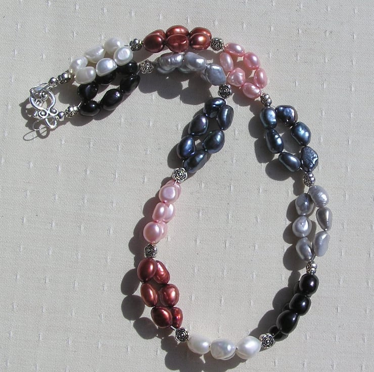This Sumptuous Necklace is made wholly from Beautiful Freshwater Pearls, clustered together in Sixes separated by a Tibetan Silver Rose Flower spacer bead... I have designed this Necklace to be a Rainbow wave of Colour using Black, Silver, Blue, Pink, Burgundy and White Freshwater Peals which will look stunning with any outfit... either the casual look or wear it with something more Elegant for a Special Evening out