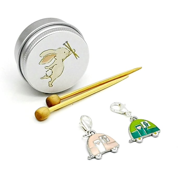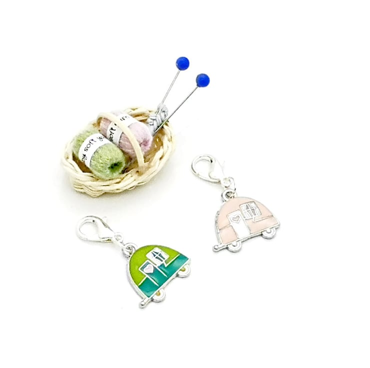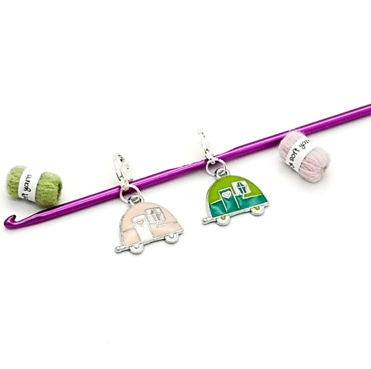 Cute retro caravan stitch markers. Perfect for all your knitting and crochet projects. The green and pink caravans are enamel on zinc metal alloy.