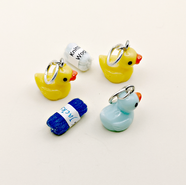 Resin duck stitch markers in yellow and turquoise attached to a snag-free silver plated soldered ring. Perfect for all your knitting projects.