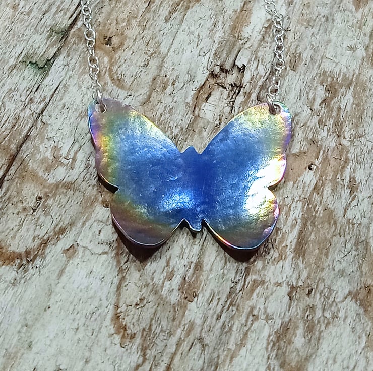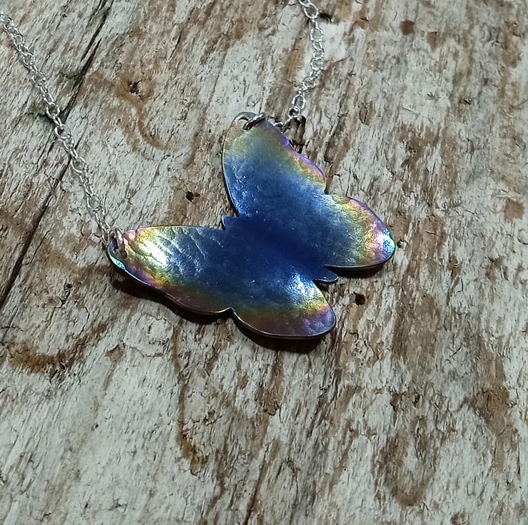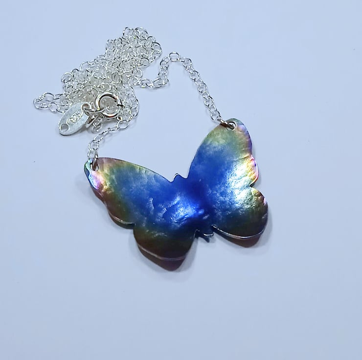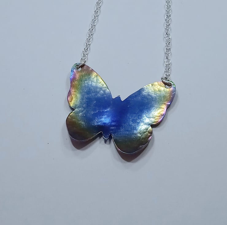 I have created this pretty necklace by hand sawing the butterfly from titanium sheet,before hammering it to create shape and then colouring. I have then constructed the necklace from sterling silver chain with a bolt ring catch.