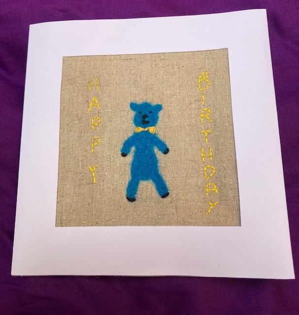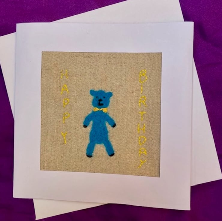 This delightful teddy has been needle felted onto linen & felt and then mounted in a white aperture greeting card (14.3cm x 14.3cm). The birthday message & jaunty little bow tie on the teddy have been hand embroidered. The card is blank inside for your own message.