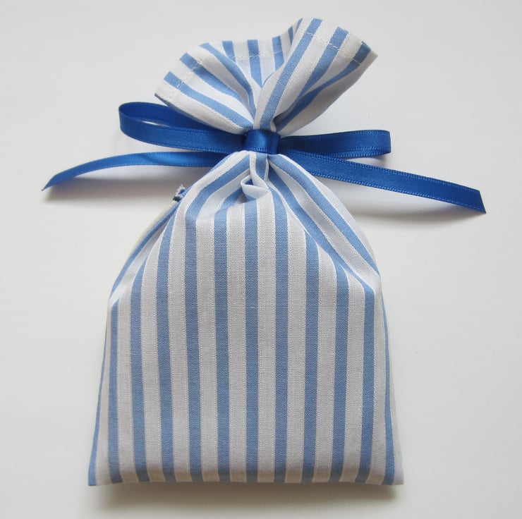 Lavender drawer sachet made from blue and white striped fabric and decorated with a vintage embroidered yachts design trim.